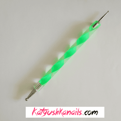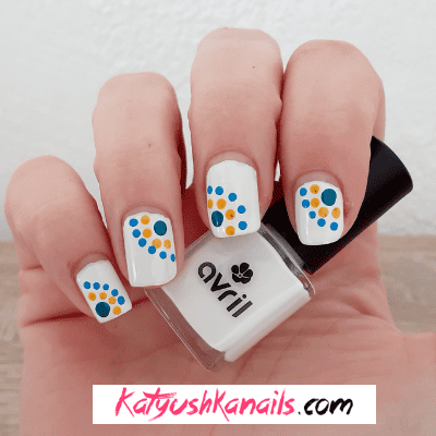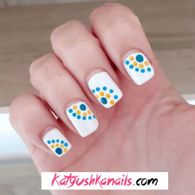 Diseño de uñas veraniego con puntos amarillo, lagoon y azul.
