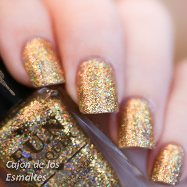 Million Dollar Dream está compuesto por glitter holográfico dorado en una base transparente. Puede usarse como "topper" por encima de otro color con una capa fina o solo, 2 o 3 manos son suficientes para cubrir la uña. Puede quedar algún hueco pero créanme que el brillo hace imposible al ojo encontrarlos. A la luz del sol es una verdadera fiesta de luces, es de esos esmaltes que te bajan el coeficiente intelectual al distraerte todo el tiempo.