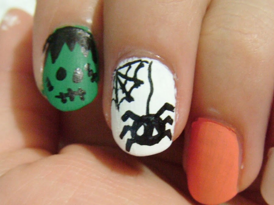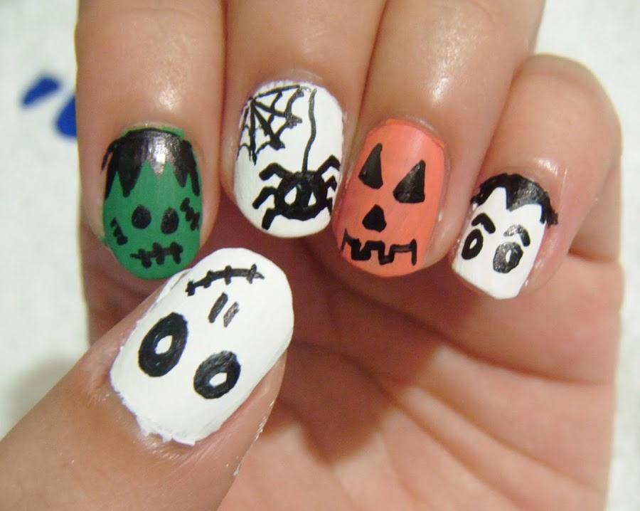 En la uña de color verde haremos un Frankenstein. Hacemos triángulos irregulares en la parte de arriba para el cabello. Luego dibujamos sus ojitos que serán dos círculos pequeños y una sonrisa, le ponemos en lo que serían sus cachetitos unas cicatrices y listo.