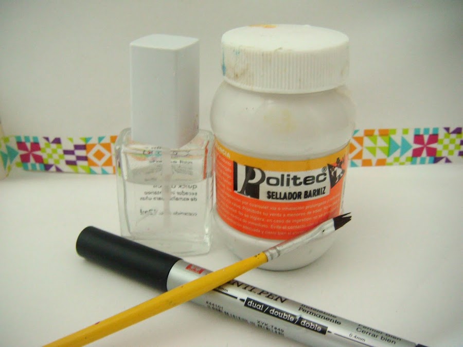 Un plumón negro permanente delgado, pincel, protector de esmalte y sellador barniz (es muy importante, lo puedes encontrar en la papelería donde compres tus pinturas o en una grande, no es muy caro.)