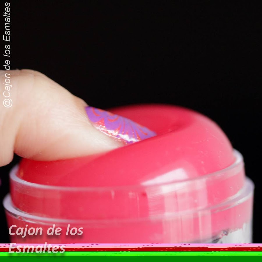 El sello rojo se ha vuelto de mis favoritos últimamente, es enorme (4cm) super super blando y ligeramente "pegajoso" lo que hace que levante perfecto el esmalte de la placa ya sea rodando o presionando. Les dejo el enlace a un post anterior donde lo pueden ver en acción y comparando con tras opciones. A dos dólares y envío gratis es una verdadera ganga (viene suelta solo la cabeza, pero sirve cualquier soporte de sello grande que ya tengan).
