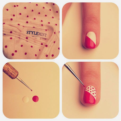 Es muy sencillo pintamos las uñas de blanco. Una vez secas, utilizando celo que pegamos en diagonal para poder pintar la otra sección en rojo. Con un palillo se van haciendo los puntos rojos sobre la sección blanca. Listo!!!