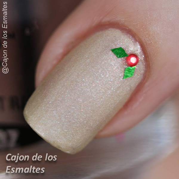 Yendo al nail art, les va a llevar menos de un minuto tenerlo pronto. Utilicé una piedrita roja y dos rombos verdes colocados con pegamento de uñas., y un escarbadiente para colocarlos. ¡Y listo! Pueden usar topcoat también para pegarlos a la uña pero como tenía un esmalte matte no quería mezclar y darle brillo a un parte de la uña.