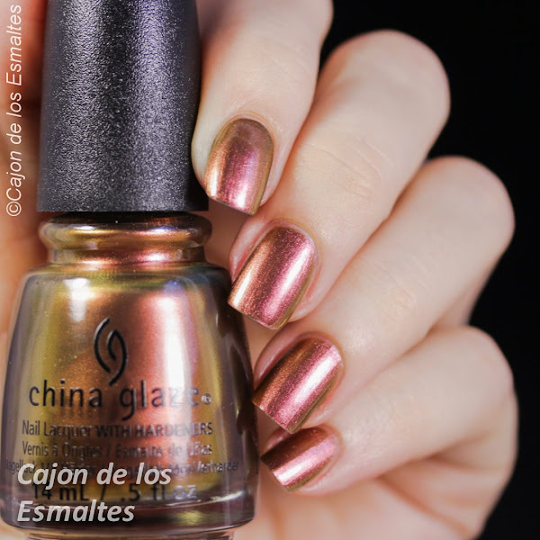 Cabin Fever es un esmalte duocromático (un metalizado que cambia de tono de acuerdo al ángulo de la luz) que oscila entre el rosado y el cobre. La opacidad de la fórmula es más que buena, no necesita base negra para mostrar el cambio de color y cubre bien con dos manos. Marca si un poco la pincelada como consecuencia del acabado metálico pero no es apreciable a distancia normal, secado medio a rápido y buena duración, sin desgaste en las puntas o saltado los cuatro días que lo tuve puesto. Más no se puede pedir.