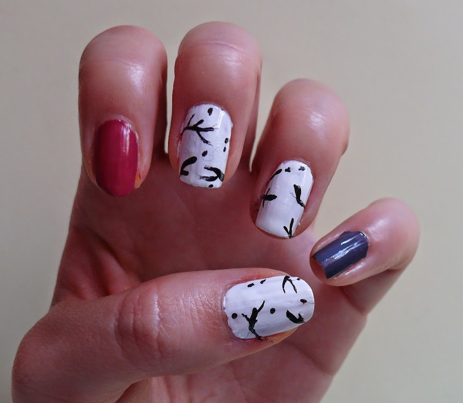 TERCERO: En las mismas uñas dibujamos "flores" en el final de las líneas negras con ambos colores. Para que no quede muy vacío, hacemos más "flores" en zonas que veamos sin dibujar.