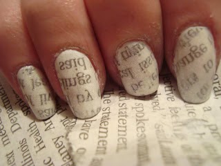 Todo lo que necesitamos es pintarnos las uñas de blanco y dejar secar bien (una noche seria perfecto). Una vez secas mojar las uñas en alcohol y pegar un trocito de periódico, dejar unos segundo y retirar. Para terminar y que el efecto perdure dar una capa de brillo o pintura transparente.