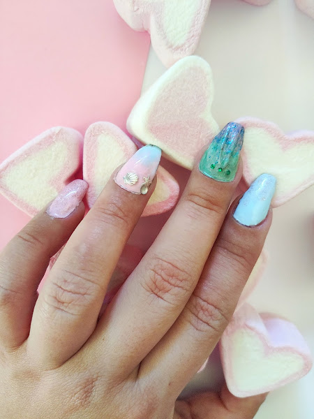 -Segundo, en el dedo anular hice un degradado de rosa a azul con los esmaltes "Milkshake Pink" y "Baby Blue" de la misma gama, primero apliqué el rosa hasta mitad y luego el azul en la otra mitad ya ellos solos se encargaron de mezclarse y dejar ese degradado tan bonito. Después añadí unas piedrecitas de nail art con forma de estrella y concha de Aliexpress, finalmente, encapsulé todo con un top coat.