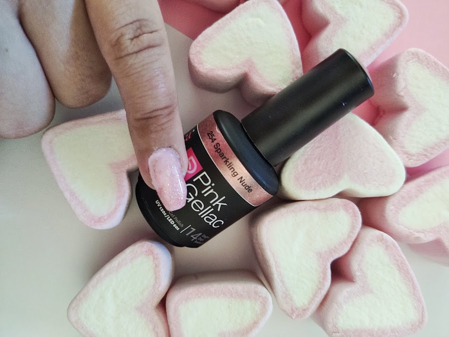 -Primero en el meñique me esmalté con el tono"Sweet Purple" de Pink Gellac, un lila pastel precioso y para darle más juego puse una fina capa del esmalte glitter "Sparkling Nude" también de Pink Gellac.