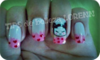 CON EL ESMALTE NEGRO Y EL PINCEL DELGADO PROCEDEMOS HACER UN PEQUEÑO CIRCULO QUE SERIA LA CABEZA DE PUCCA, EN LA PARTE DE ARRIBA DEL CIRCULO HACEMOS UNA LINEA GRUESA DE COLOR NEGRO, CON ESMALTE COLOR PIEL PROCEDEMOS A RELLENAR MUESTRO CIRCULO SIN TOCAR LA LINEA NEGRA, CON EL ESMALTE NEGRO Y EL PINCEL DELGADO HACEMOS DOS LINEAS RECTAS LOS CUALES SON SUS OJOS,Y DOS LINEAS CURVAS Y CORTAS QUE SERIA SUS CEJAS, EN LA PARTE SUPERIOR Y POR FUERA HACEMOS SUS MOÑOS CON COLOR NEGRO, CON EL ESMALTE ROJO Y UN PALILLO PROCEDEMOS HACER LOS CORAZONES EN CADA FRANCÉS HECHO EN LAS UÑAS Y TERMINAMOS EN CADA UNA CON UNA CAPA DE.ESMALTE BRILLO SECANTE.