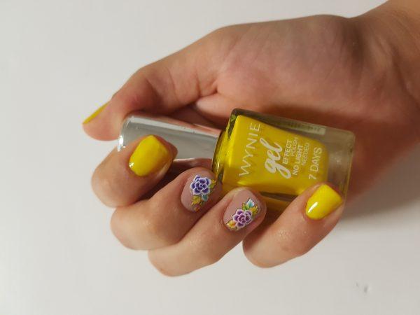 Aplica esmalte amarillo efecto gel en tus uñas.
