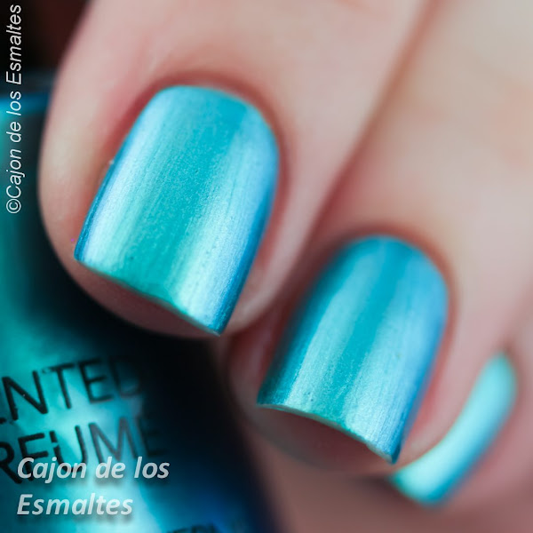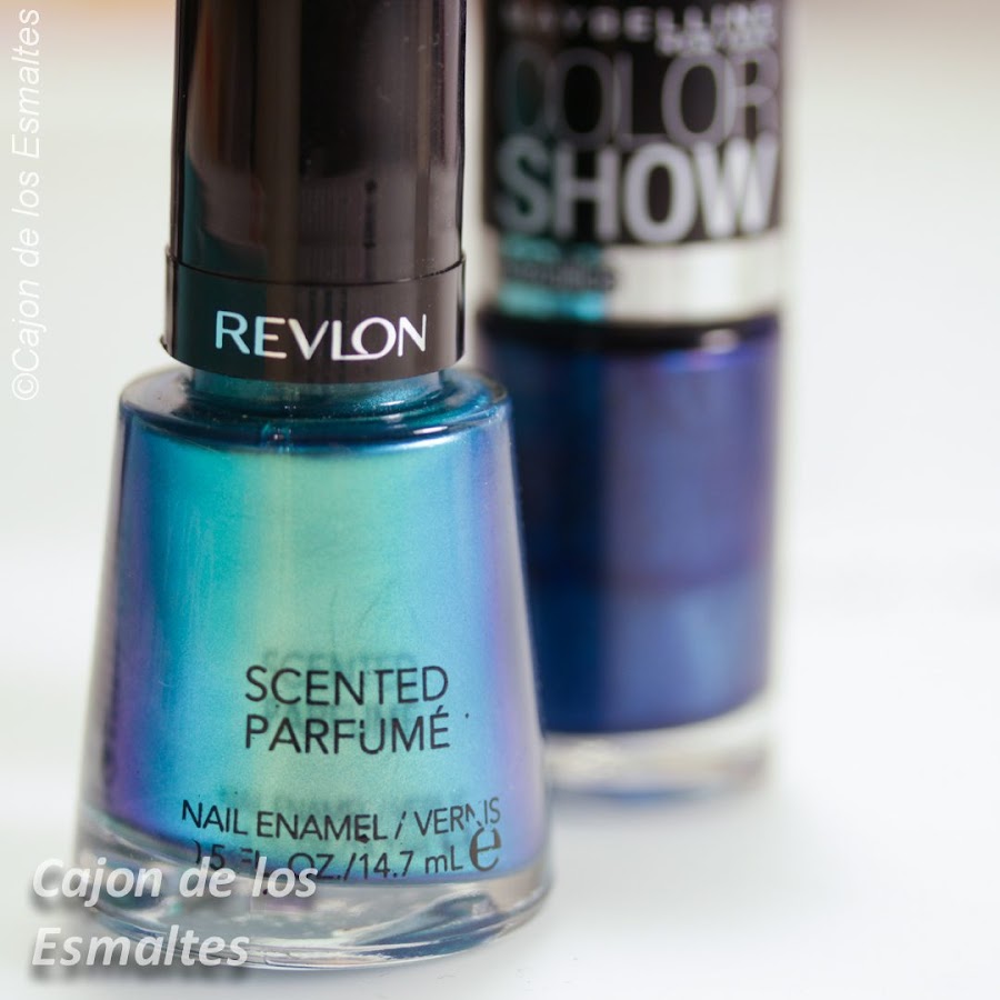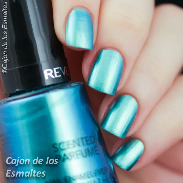 Y pasamos al color de base porque esta belleza se merece también su lugarcito. Ocean Breeze de Revlon es de la línea de esmaltes de uñas perfumados o con aroma. Es bastante veterano de una colección del 2011 y lo conseguí en el freeshop del aeropuerto de Montevideo. A nivel de aroma no me llama la atención, tiene un olor muy suave que se va al segundo día y me recuerda más a un aromatizador de auto que al mar. Donde si destaca es por su color, es un duocromo verde/azulado que si evoca al océano. Hay que ser cuidadosa con la aplicación para no marcar las pinceladas pero bien vale la pena.