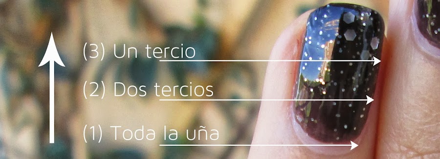 Al principio no terminaba yo de ver cómo conseguir el efecto ahumado, pero como se trata de un top coat con glitter plateado de diferentes tamaños que flotan en esmalte transparente con algo de tono negro, vi claro el efecto: se trata de "difuminar" el esmalte como cuando difuminamos el eyeliner en los ojos, o la sombra negra, para conseguir el efecto ahumado.