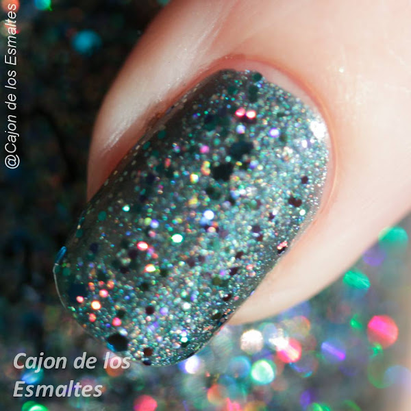 Yendo al esmalte, Peacock Portrait de Finger Paints tiene una base transparente a pesar que no lo parece. Así que inspirada por el color de la botella usé un verde similar y luego una mano de Peacock Portrait. Tiene glitter verde, rojo y holográfico de diferentes colores. Se los muestro un poco desenfocado para apreciar el arco iris.