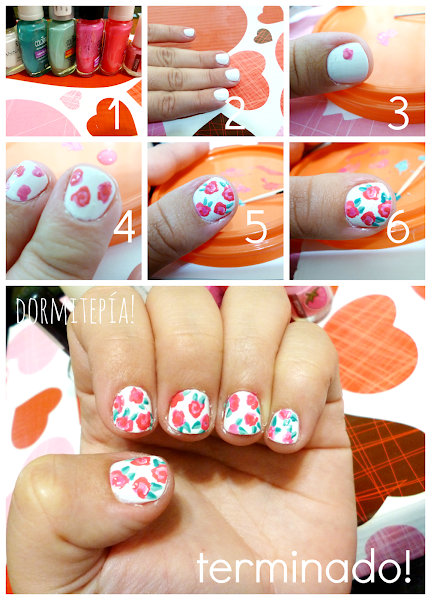 Prepará los esmaltes para tenerlos a mano: 3 tonos de rosa, 2 tonos de verde y blanco para la base. También tené a mano algo plástico para tirar las gotas de esmalte y algún palito para usar de pincel (palillos de madera, la punta de una hebilla invisible, una birome que no te ande...)