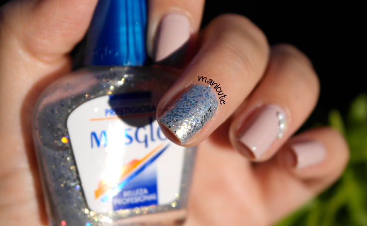 Prestigiosa me gusta porque la purpurina es doradita, plateada, irisada y holográfica pero, además, en lugar de encontrarse en esmalte transparente, se encuentra en esmalte con un ligero tono champán. Esto permite que la uña quede mucho más cubierta. No obstante, para lograr un resultado óptimo, yo lo he aplicado con una esponjita de maquillaje, de esas triangulares que al final nadie usa. Aquí os explico cómo hacerlo