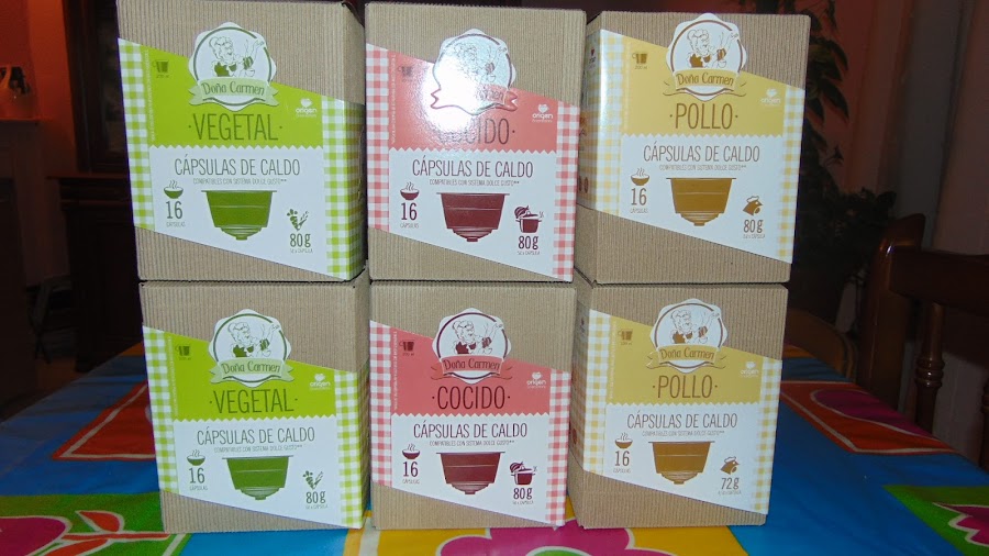 Cápsulas de Caldo Doña Carmen, aptas para Cafetera Nescafé Dolce Gusto: Llega el invierno y muchas veces apetece tomarse un caldo caliente para entrar en calor. Ahora es posible prepararlo al instante sin esperar más que unos segundos y sin ensuciar. Prepara un delicioso caldo desde tu cafetera Dolce gusto y disfrútalo en cualquier momento. Tres sabores disponibles pollo, cocido y vegetal. Cada pack contiene 16 cápsulas de caldo. Limpiar la cafetera después de uso sobre todo si la usáis después para hacer café para que no se os mezclen los sabores. Aproximadamente con una cápsula sale un vaso o taza de caldo. Precio 4,49 la unidad. Después de probarlas puedo decir que tienen un sabor muy rico y natural, no parece el típico caldo preparado y tiene un sabor intenso, no es nada aguado.