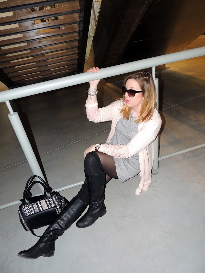 ¡Buenos días chicos! Hoy os enseño un look muy casual llevado a un rollo underground, o mejor dicho under stairs... Que el gris es mi color favorito para vestir no es ningún secreto y combinado con el rosa palo ya si que sí me vuelve loca, esta combinación de colores me resulta muy dulce y favorecedora ya de por si, pero esta vez quise darle un contrapunto con complementos en negros que le dan un toque muy cañero al look. El lugar ,un tanto extraño, (fotografiar un look en un centro comercial lloviendo fuera a mares era complicado), encontramos este pequeño rincón que al final fue el toque final para una sesión de fotos con mucha personalidad, fotos en interior y tirando de flash, cosa que no acostumbro pero en esta ocasión si que me gustaba el resultado y además pasamos un rato muy divertido haciendo el tonto (cosa que se nos da muy bien). Espero os guste el resultado y nos vemos la semana que viene, desde otra ciudad a la que tengo muuuchas ganas de ir, os iré contando :)