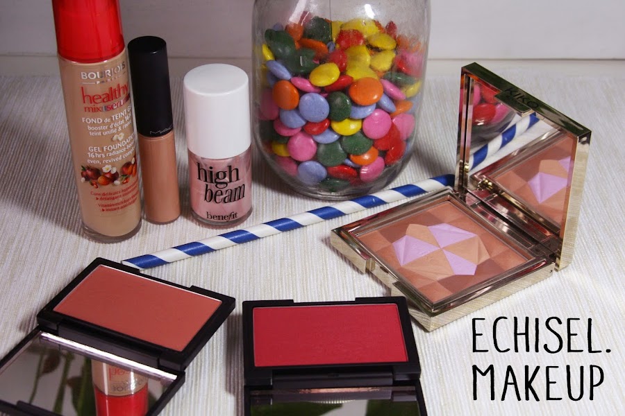Los productos utilizados en el rostro son éstos que podéis ver en la foto. Creo que casi ninguno necesita presentación. Los polvos son de Kiko de colección. Y para dar un poco de calidez al rostro utilicé el colorete Suede y el Flushed de Sleek.