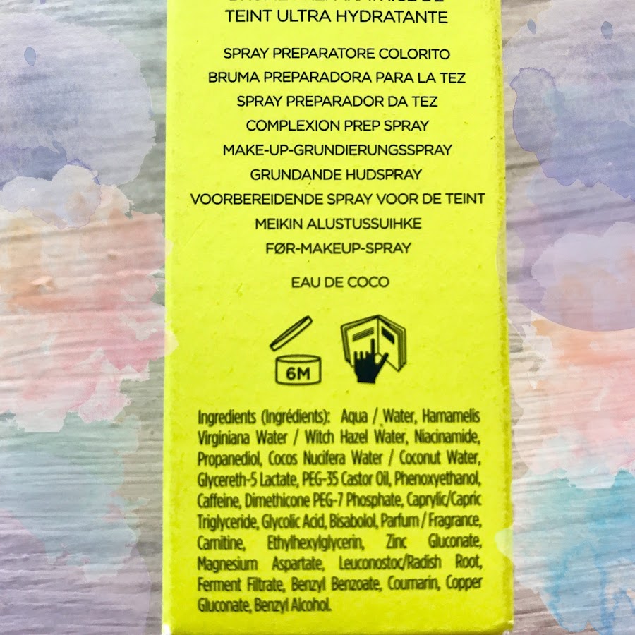 Water, Hamamelis Witch Hazel Water, Niacinamide, Propanediol, Coconut Water, Glycereth-5 Lactate, PEG-35 Castor Oil, Phenoxyethanol, Caffeine, Dimethicone PEG-7 Phosphate, Caprylic/Capric Triglyceride, Glycolic Acid, Bisabolol, Fragrance, Carnitine, Ethylhexylglycerin, Zinc Gluconate, Magnesium Aspartate, Radish Root, Ferment Filtrate, Benzyl Benzoate, Coumarin, Copper Gluconate, Benzyl Alcohol.