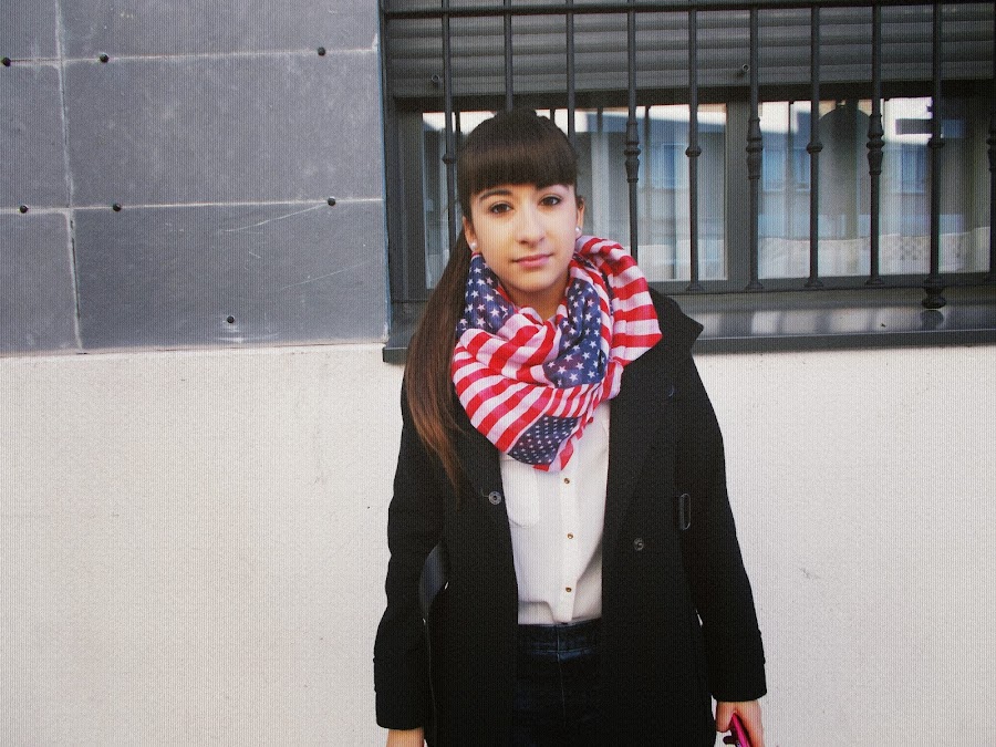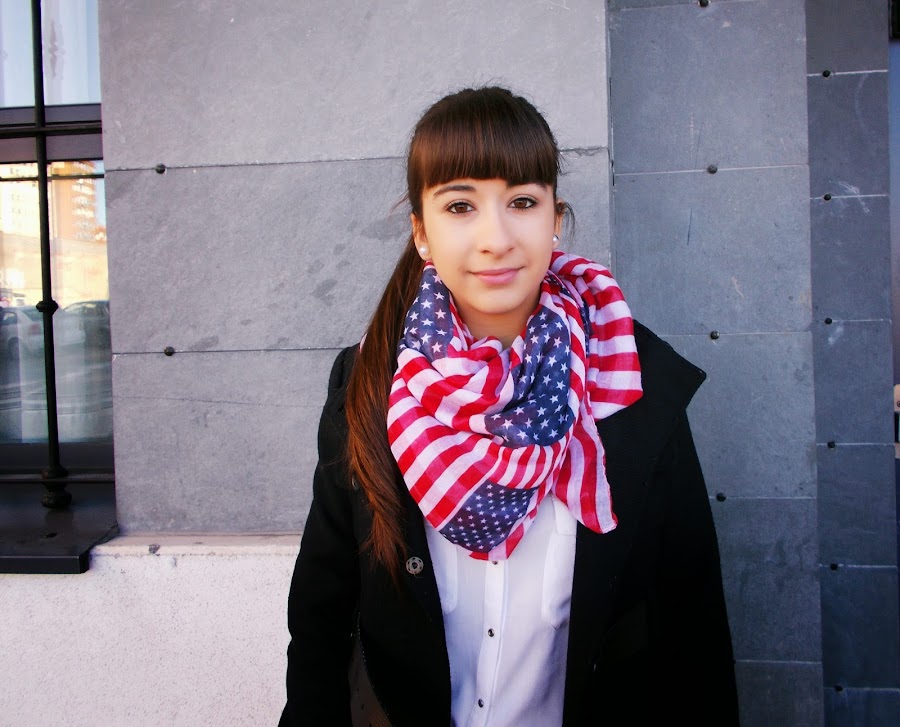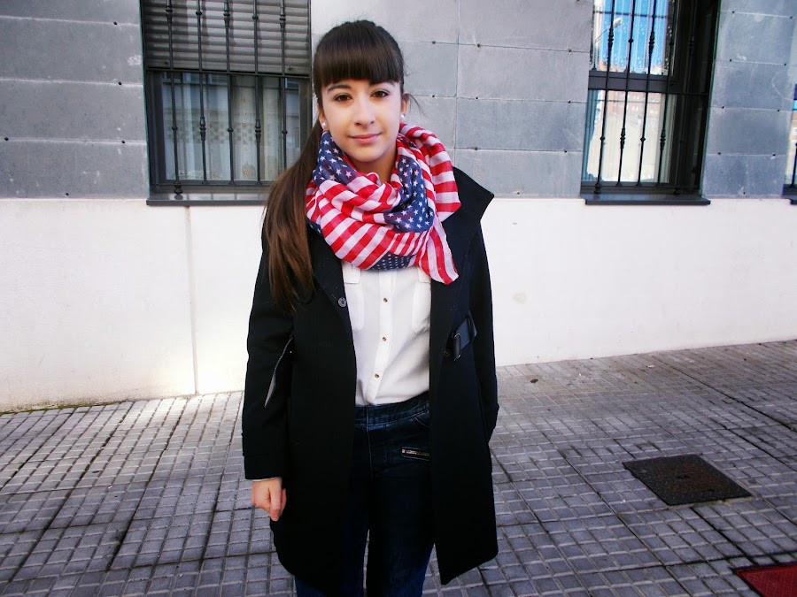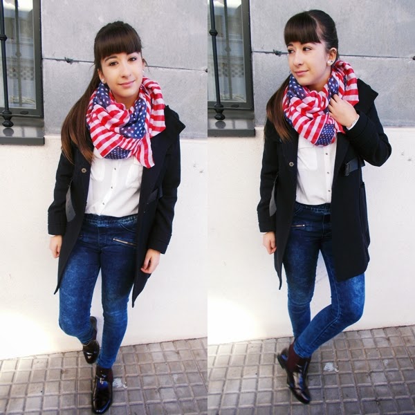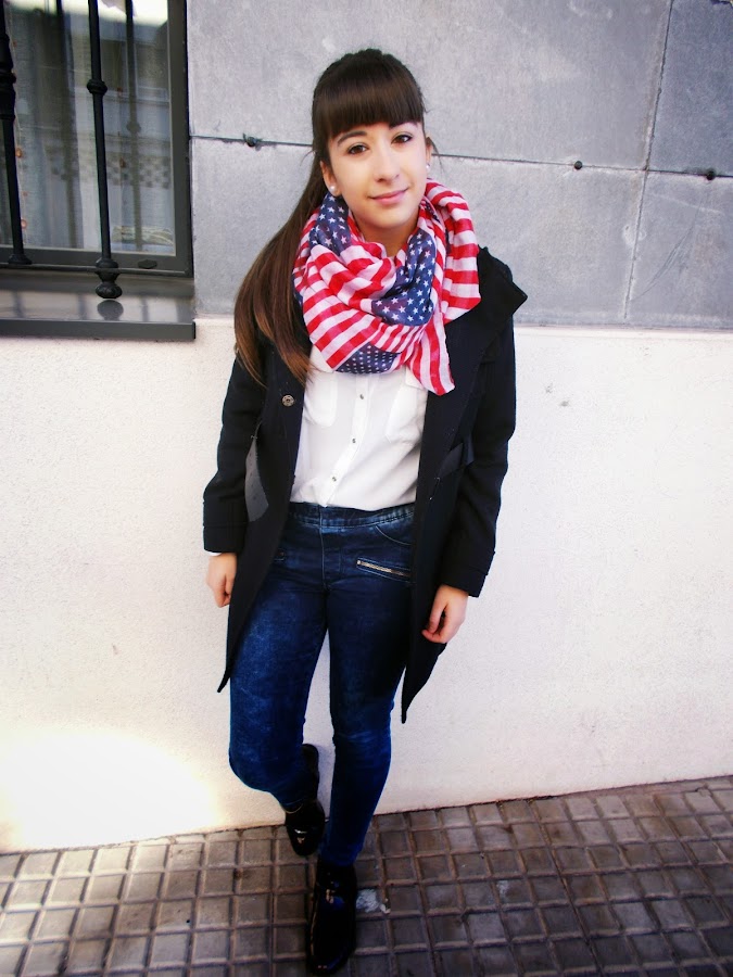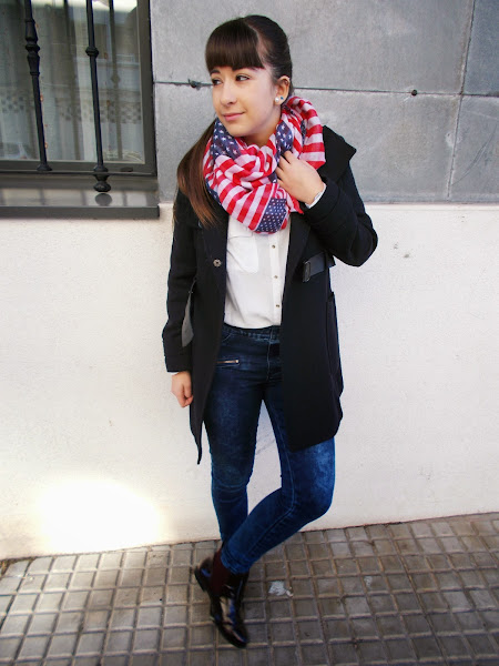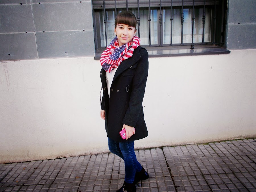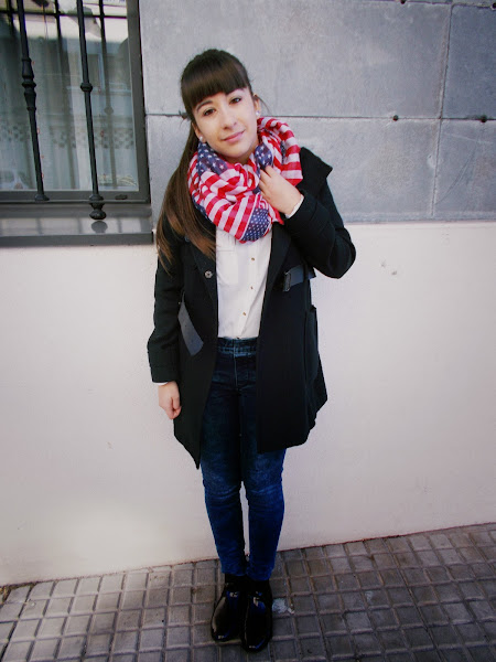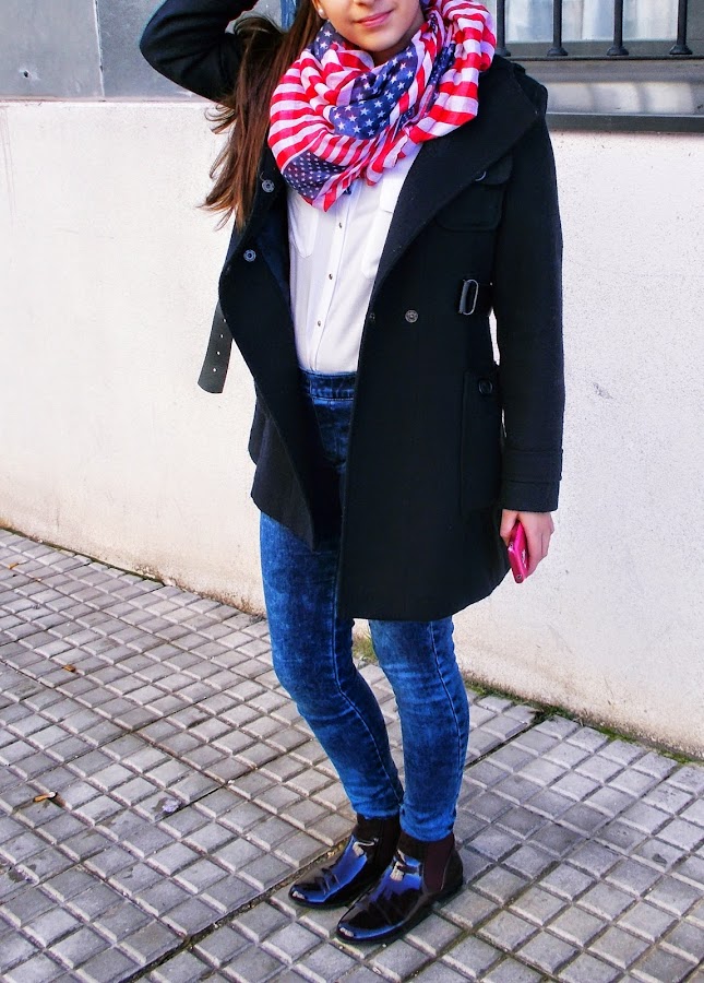 El outfit se compone de un pañuelo de la bandera estadounidense que tenía perdido por el armario, una camisa blanca básica, mis jeans preferidos, los botines granates que últimamente no me quito y para el frío mi trenca de hace un par de años.