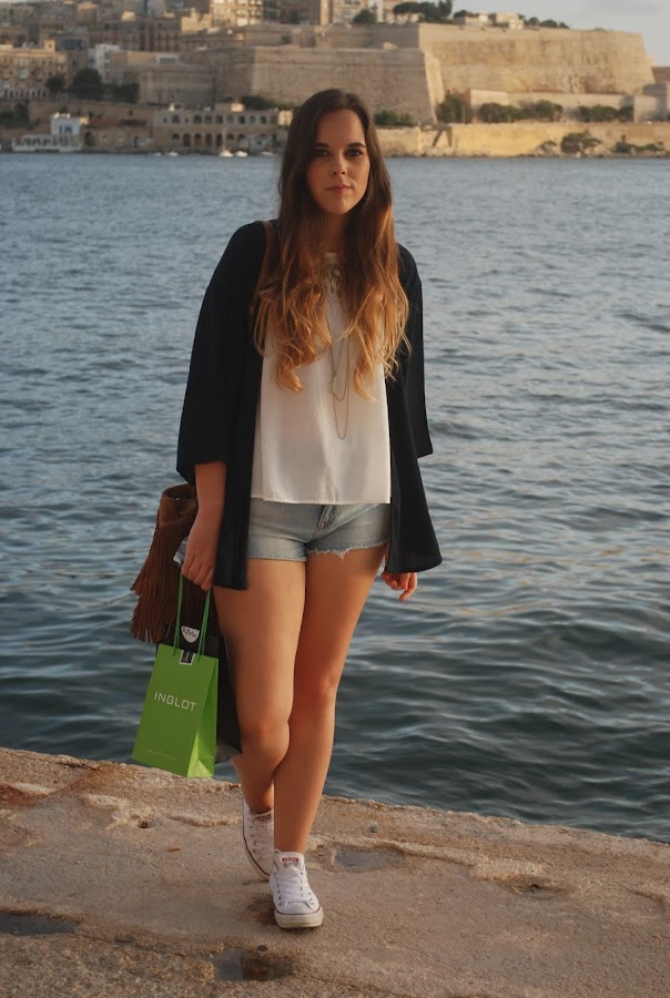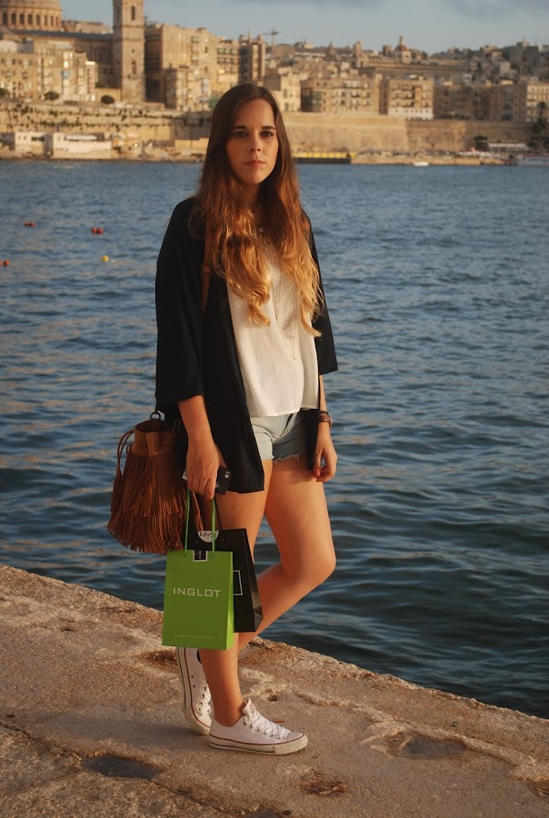 Como hacía un poco de fresco, aproveché para ponerme este kimono azul que me compré en rebajas y que, aunque lo he usado mil veces, aún no había salido aquí. El resto del outfit ya lo conocéis porque lo enseñé en otro de los post malteses, pero como estas fotos son tan bonitas no me ha importado repetir.
