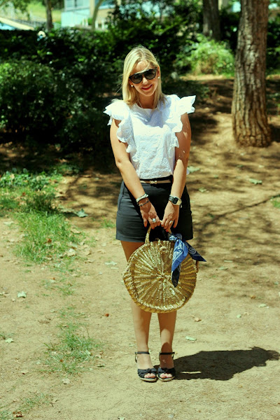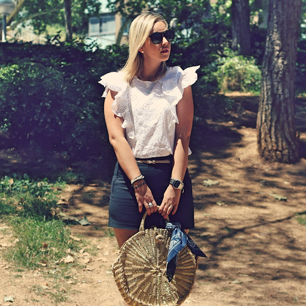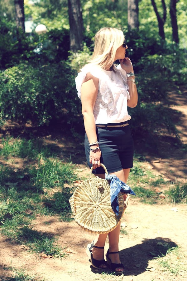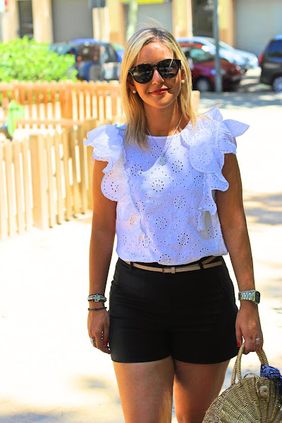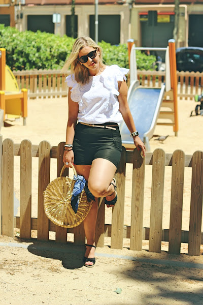 Today I show you a very easy outfit that I think that its the kind of outfits that are perfect for the summer. In the outfit of the day, I wear my new embroidered white shirt with ruffles that I liked because it was very sweet and feminine. I wear it with black shorts and two of my purchases of the Sales, black sandals with esparto and my new round bag of Women Secret that it was sold out in the website, but I found it in the shop and I had to buy it.