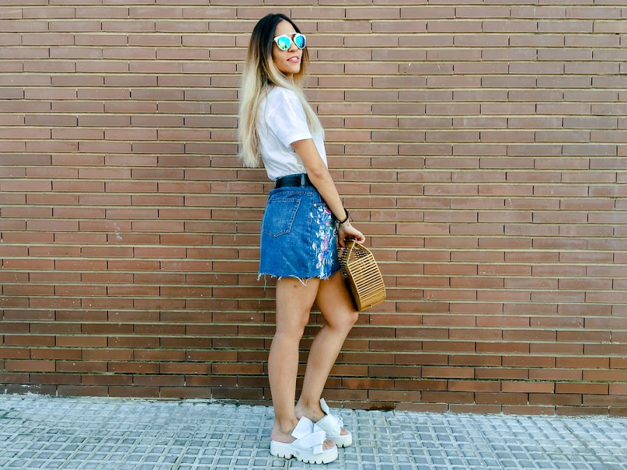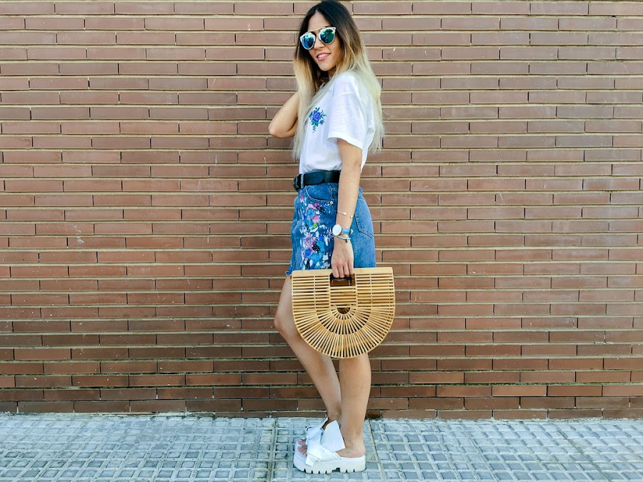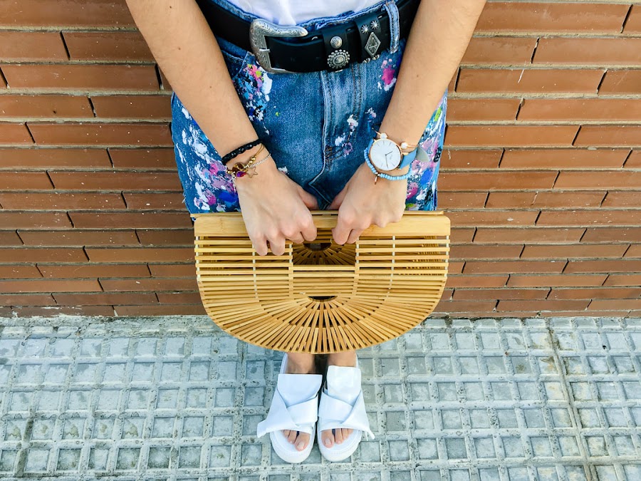 La he combinado con una falda denim con estampado de pintura de colores de ZAFUL y mis sandalias de plataforma y lazo de JESSICA BUURMAN. Pero además, os traigo unos complementos muy especiales, con un bolso super original de bambú, que seguramente ya habréis visto en miles de fotos de Instagram, porque se lleva muchísimo! Yo no he podido resistirme a él y aquí lo tengo! Es de JESSICA BUURMAN y es que estoy enamorada de esta tienda! Por cierto, está de sorteo en Instagram, por si queréis participar!!