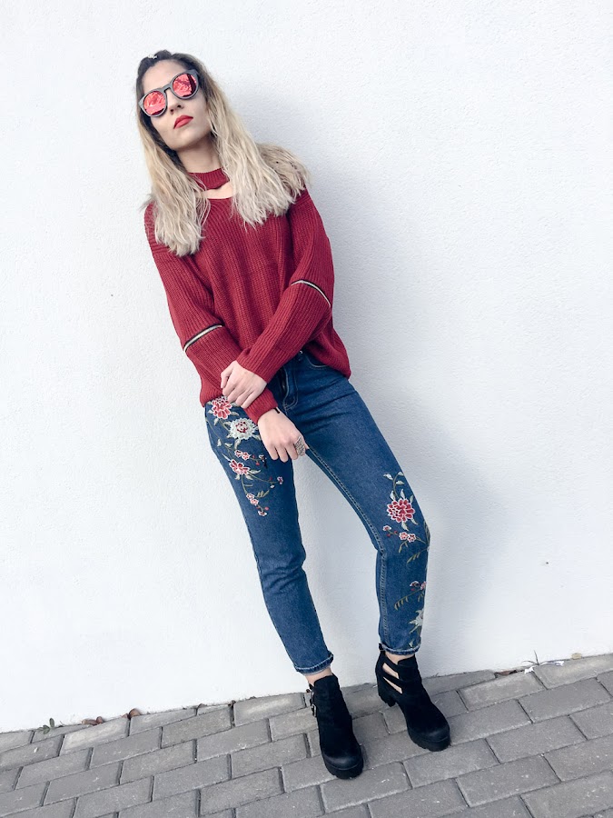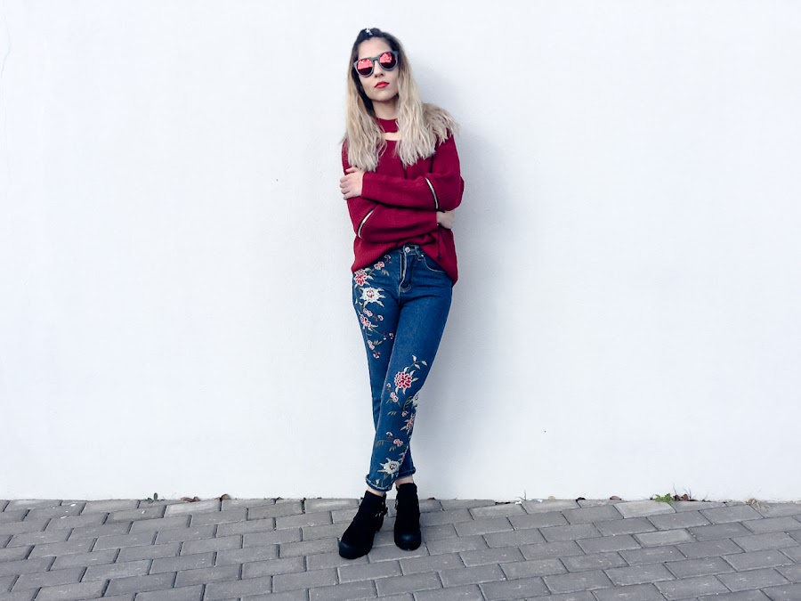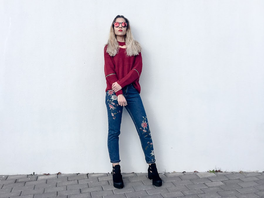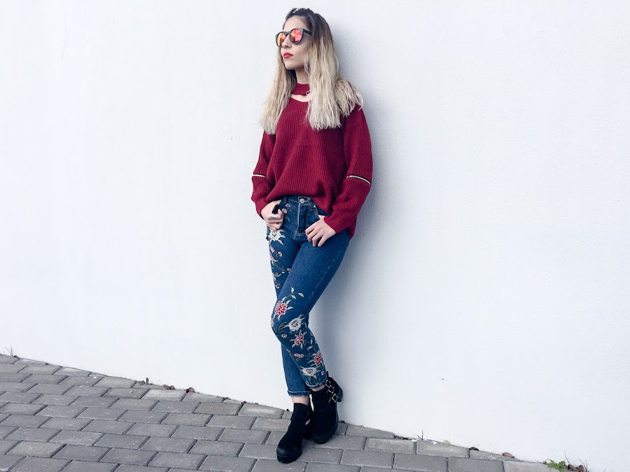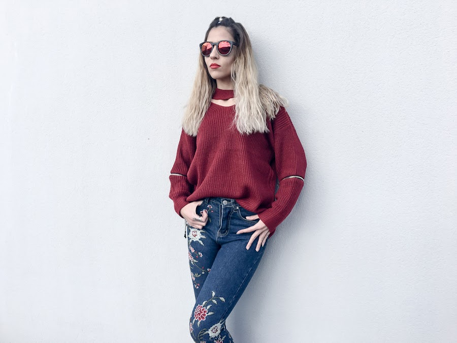 Hoy os traigo otro un look que me encanta!! El jersey es súper original con un escote choker y cremalleras en las mangas. Lo he combinado con uno de mis jeans favoritos, con un bordado floral que recorre todos los jeans!! Ya sabéis que soy muy fan del denim y tengo que tener mil de ellos en el armario de mil maneras diferentes!!