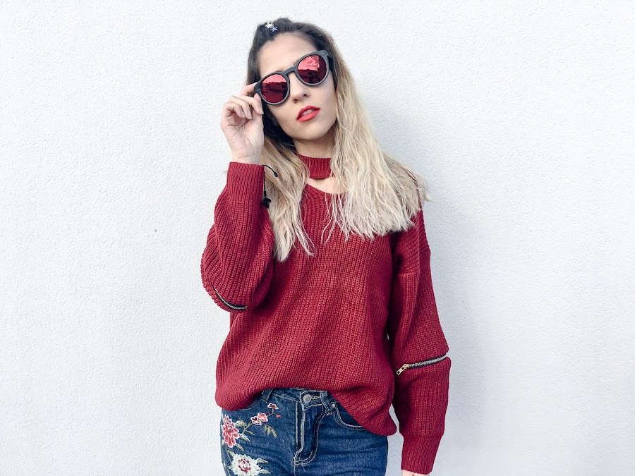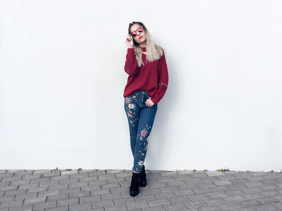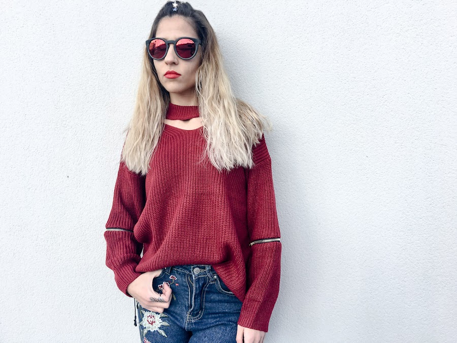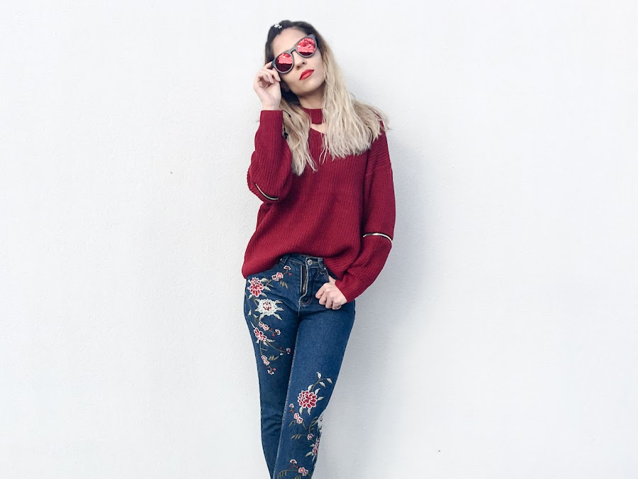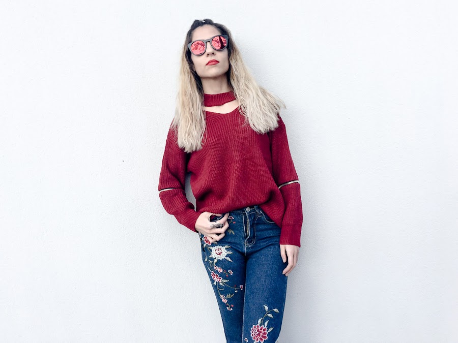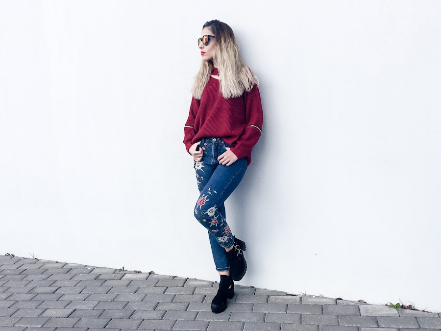 Hoy os traigo otro un look que me encanta!! El jersey es súper original con un escote choker y cremalleras en las mangas. Lo he combinado con uno de mis jeans favoritos, con un bordado floral que recorre todos los jeans!! Ya sabéis que soy muy fan del denim y tengo que tener mil de ellos en el armario de mil maneras diferentes!!