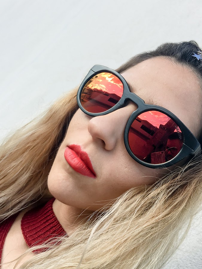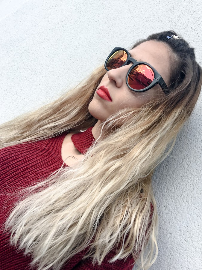 To finish off the look, I have chosen mybuckle booties, very cool wooden sunglasses with red crystals of and finally, my hair accessories