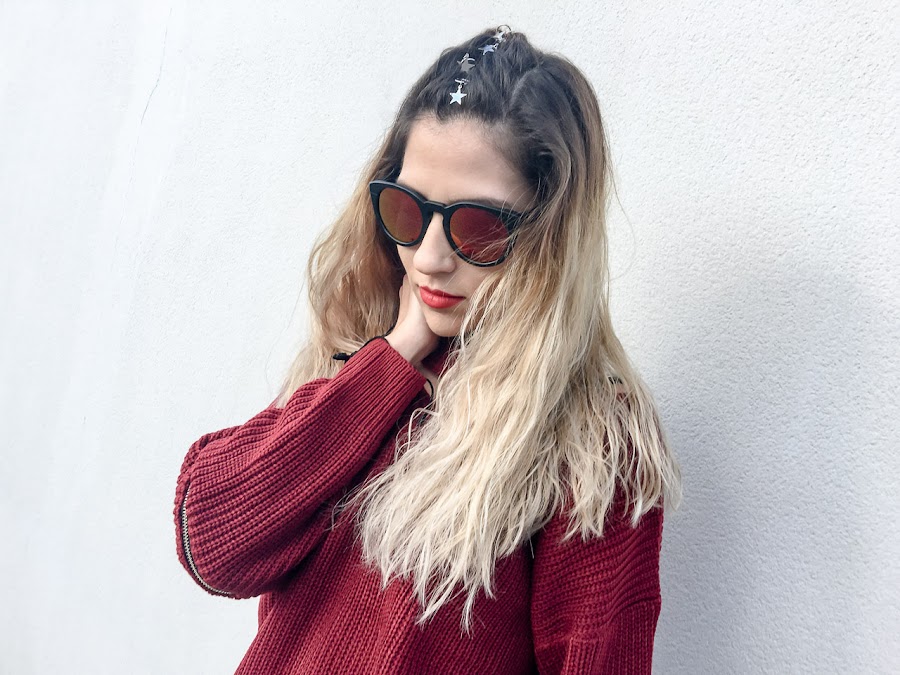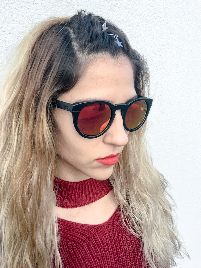Para rematar el look, he elegido mis botines de hebillas, unas gafas de sol súper chulas de madera con cristales rojos y por último, mis accesorios para el cabello con estrellas.