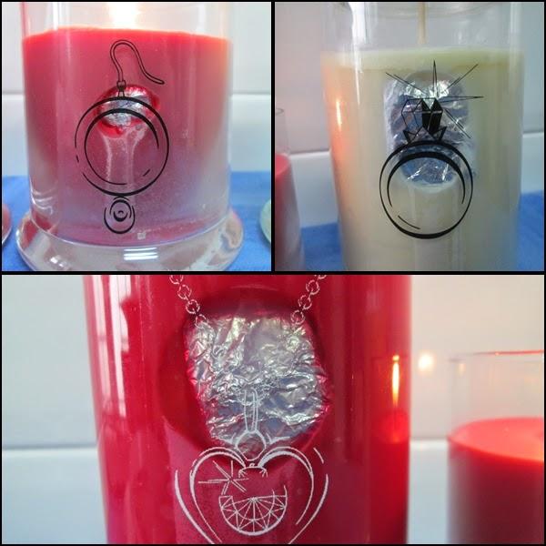 Me parece una idea original y llamativa, que dentro de una vela se encuentre una pieza de joya. Sobre todo, es una idea divertida para hacer un regalo... Pero sinceramente, me ha sorprendido y gustado más la vela, por el olor que desprende en la habitación, que las propias joyas (y eso que desconozco como serán las otras dos joyas..., jejeje, pero con esto no digo que no me gusten las joyas, ¿eh?, jejeje, la verdad, es que son preciosas y que a todas os gustarán...).