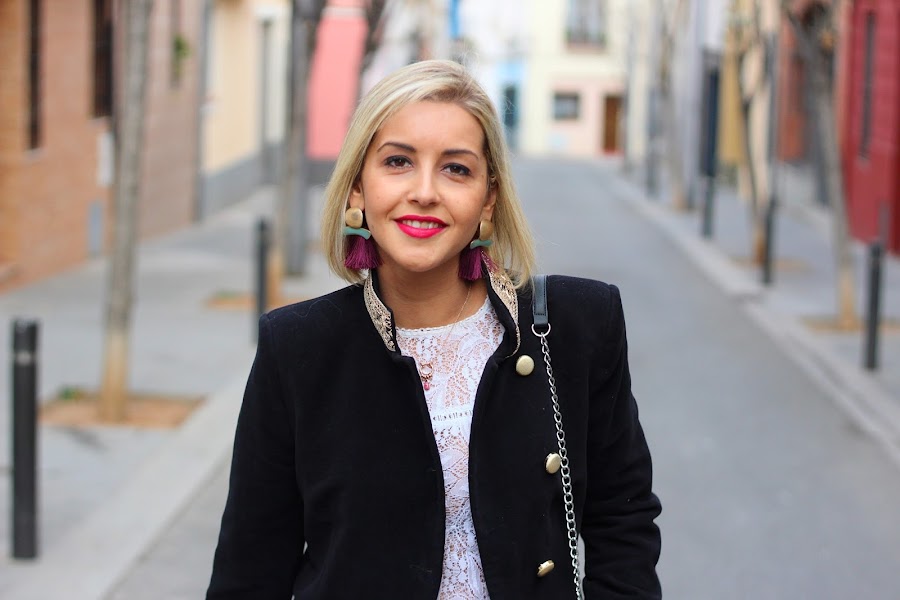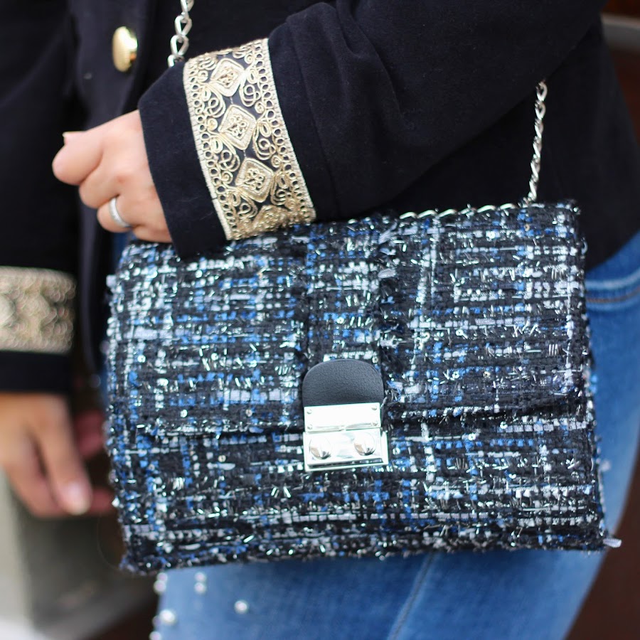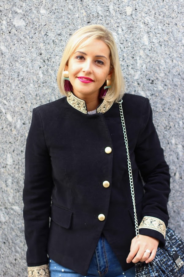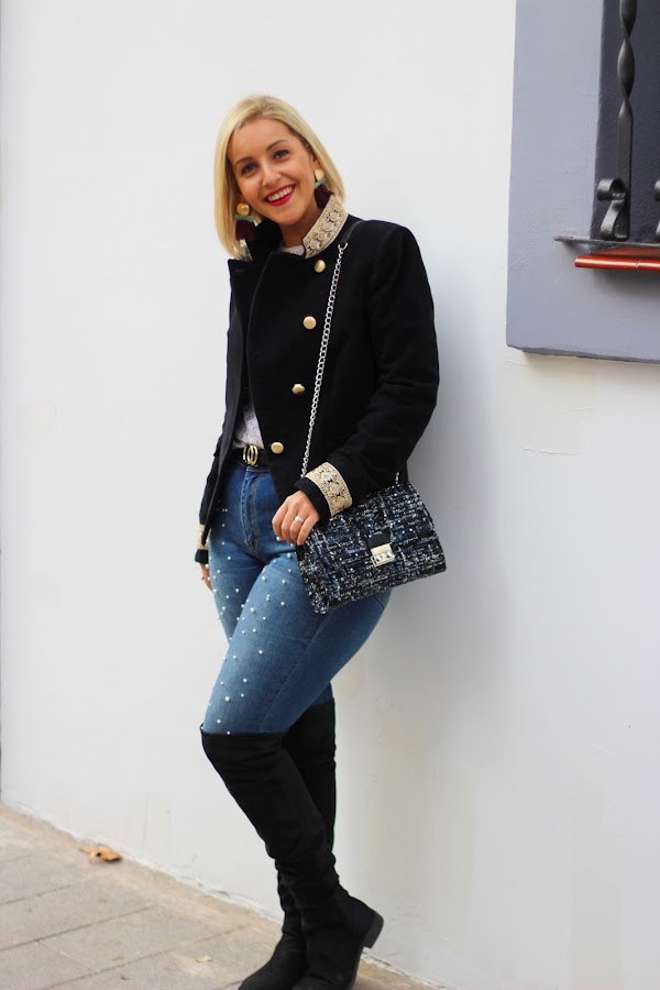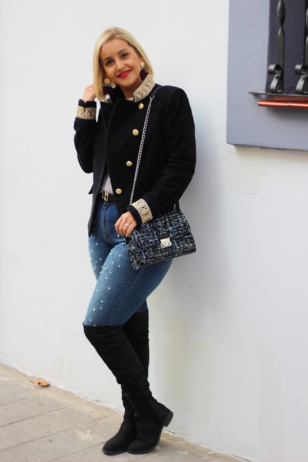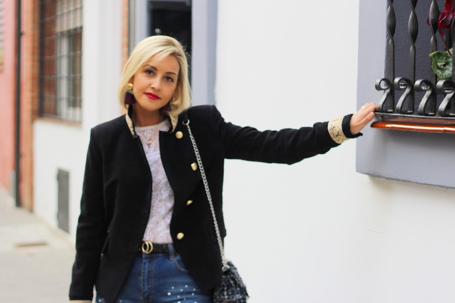 En el look de hoy, llevo mi nueva chaqueta de terciopelo con detalles dorados en el cuello y en las mangas que combiné con una camiseta blanca de encaje y mis jeans de perlas.