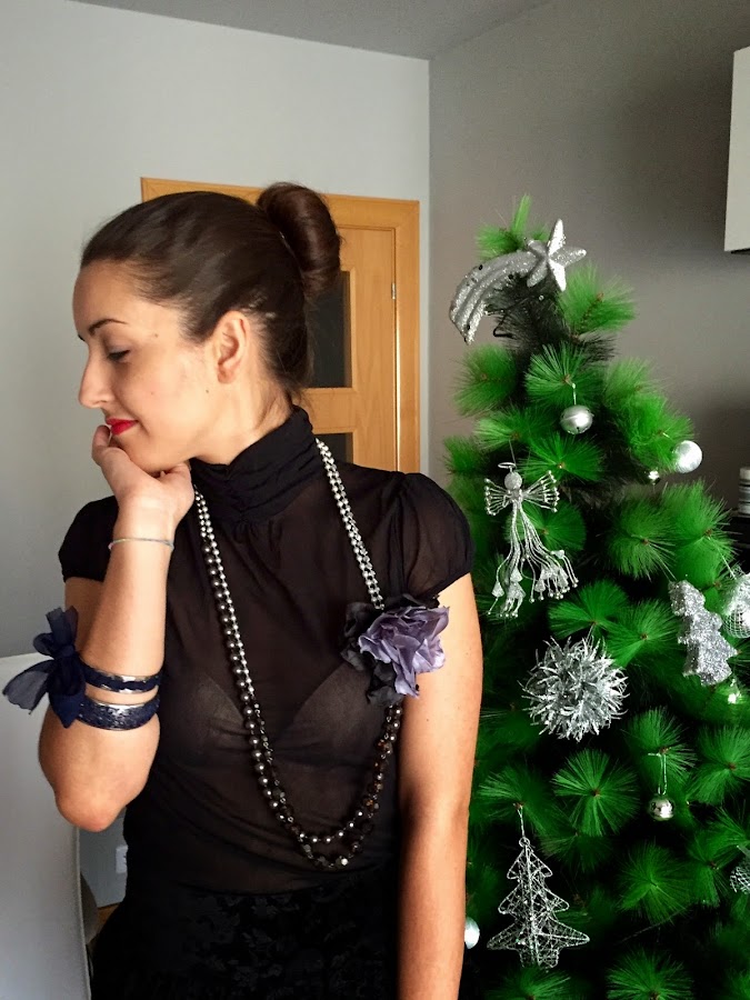 ¿Qué os parece el look de hoy? Muchas gracias por vuestras visitas y comentarios.Good night sweeties! The Christmas is coming and in these days we have a lot of dinners and meals with the family and friends. Today I show you a outfit to wear for these days. In the outfit of the day I wore a velvet skirt with a black transparent shirt. The accessories of the outfit were a necklace with a flower, black stilettos and a hand bag. To give a touch of chic to the outfit, I did a topknot and make-up very soft.