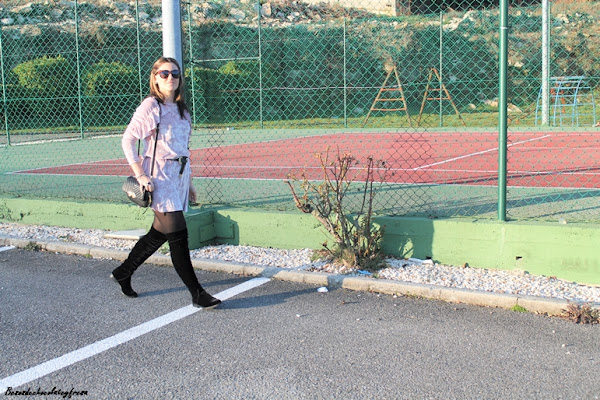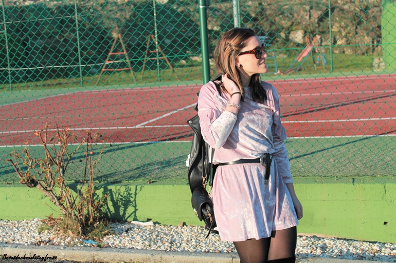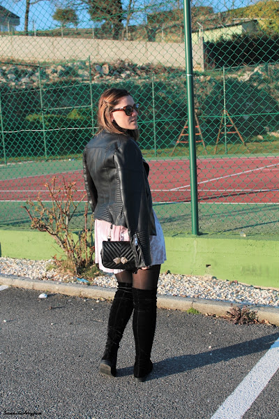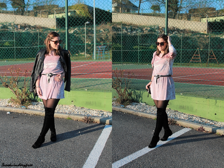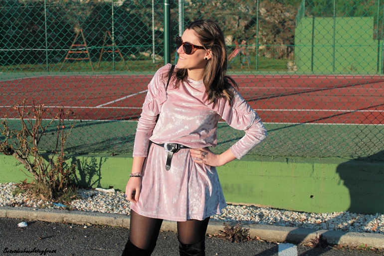Total look en velvet con vestido en rosa empolvado y botas XXL negras