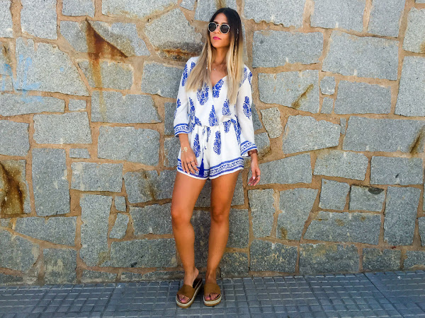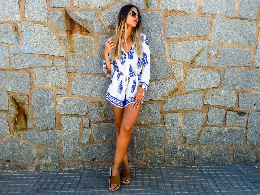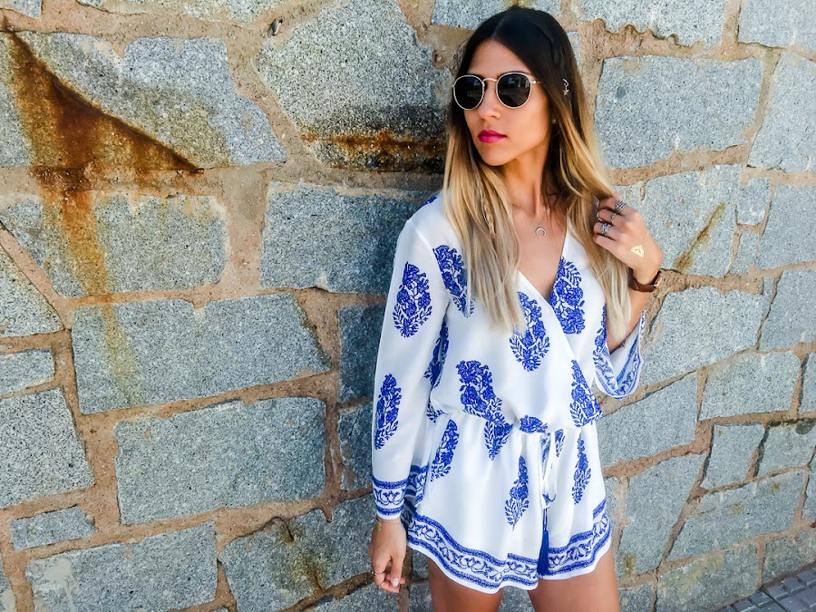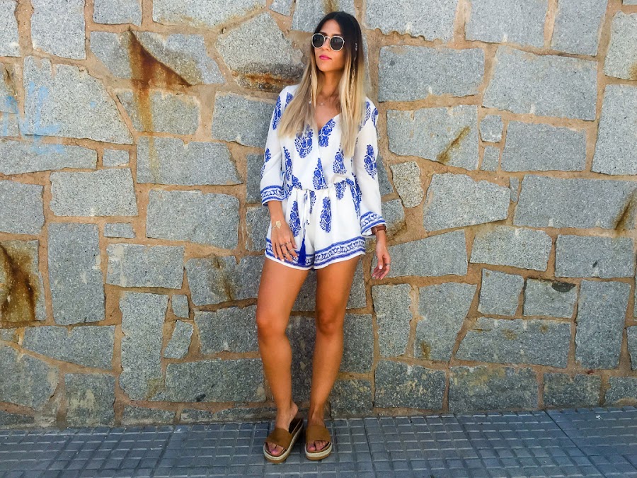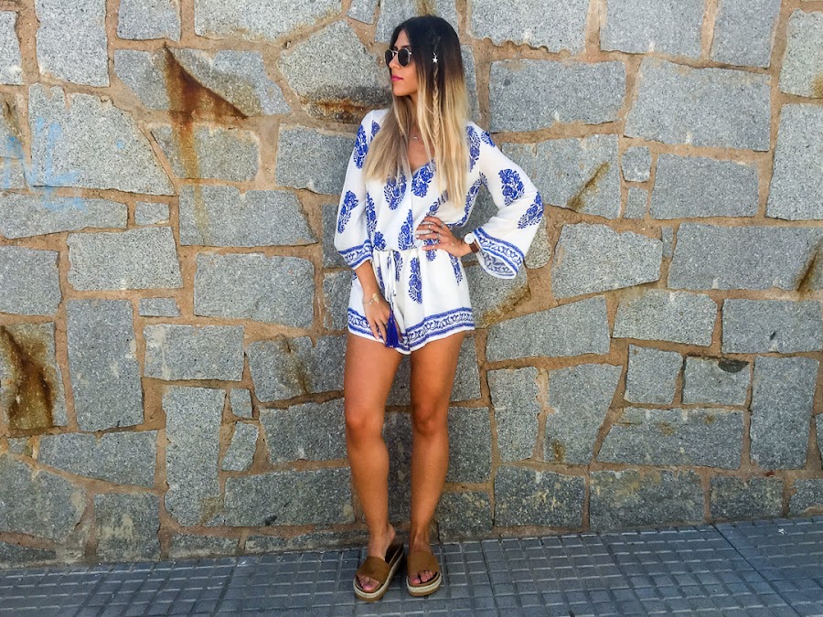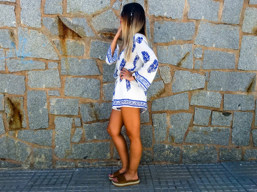 Y vamos a hablar del look de hoy. Os confieso que uno de los estilos que más me gusta para el verano es el estilo boho. Y así es el estilo que he elegido para hoy lunes, para que se nos haga menos pesado. Un mono cortito blanco con estampado de plumas y con goma ajustable en la cintura. La tela es súper fresquita para el verano y es súper cómodo! Es de LOOKBOOK STORE y creo que se ha convertido en la prenda estrella de mi armario.