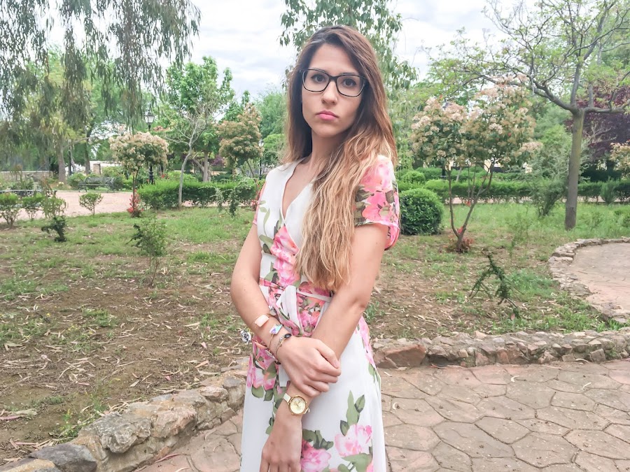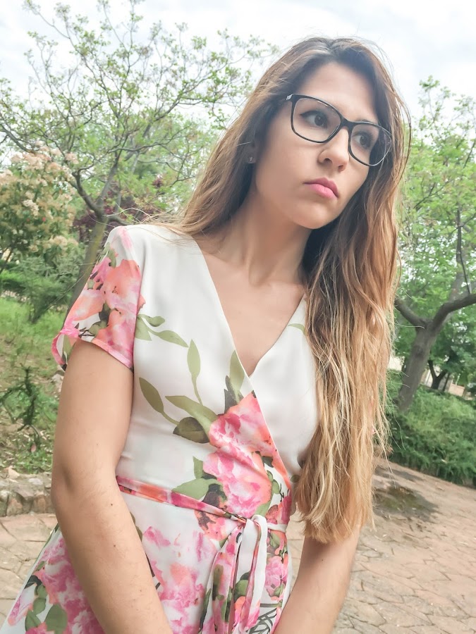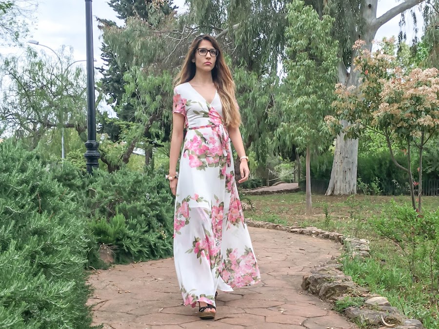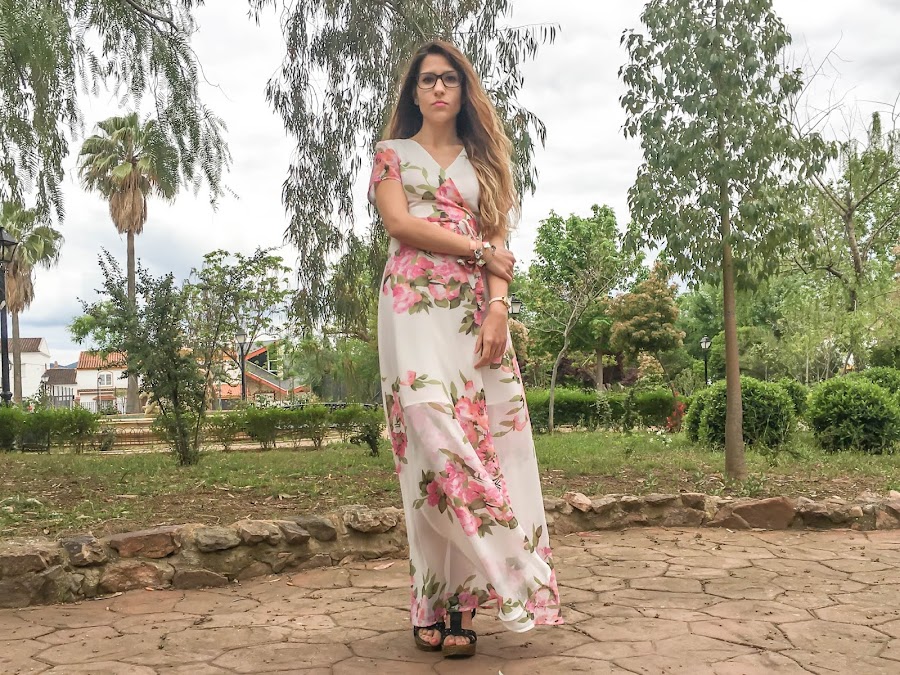 En verano me encanta llevar vestidos largos, me resultan súper frescos y cómodos y el de hoy, desde luego, no se queda atrás. De manga corta, con un estampado floral en un fondo blanco impoluto y cruzado en el pecho, atado por un lazo en la parte delantera.