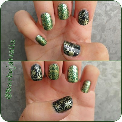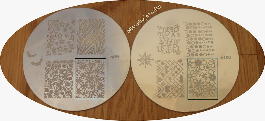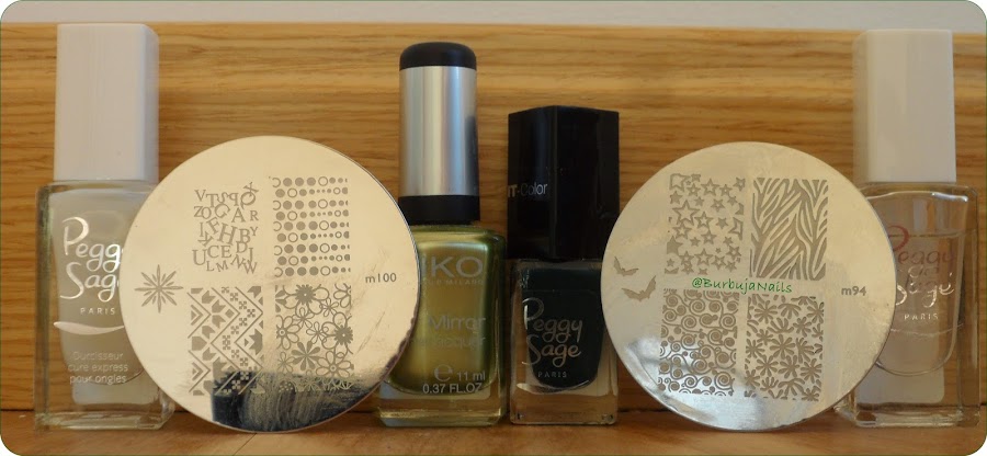 3. Cuando están secas estampamos sobre el esmalte de peggy el diseño de la placa m100 usando el mirror y en el resto de las uñas estampamos el diseño de la placa m94 usando el esmalte de peggy.