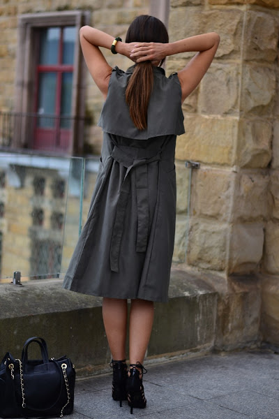Hoy os enseño un total look de Romwe, compuesto por chaleco fluido largo de corte masculino, tipo trench, con cinturón y vestido corto de rayas verticales, con cuello redondo y manga sisa, muy fresquito para ir a la oficina en verano, por ejemplo, en esos días en los que, como hoy, está nublado y hace fresquito.