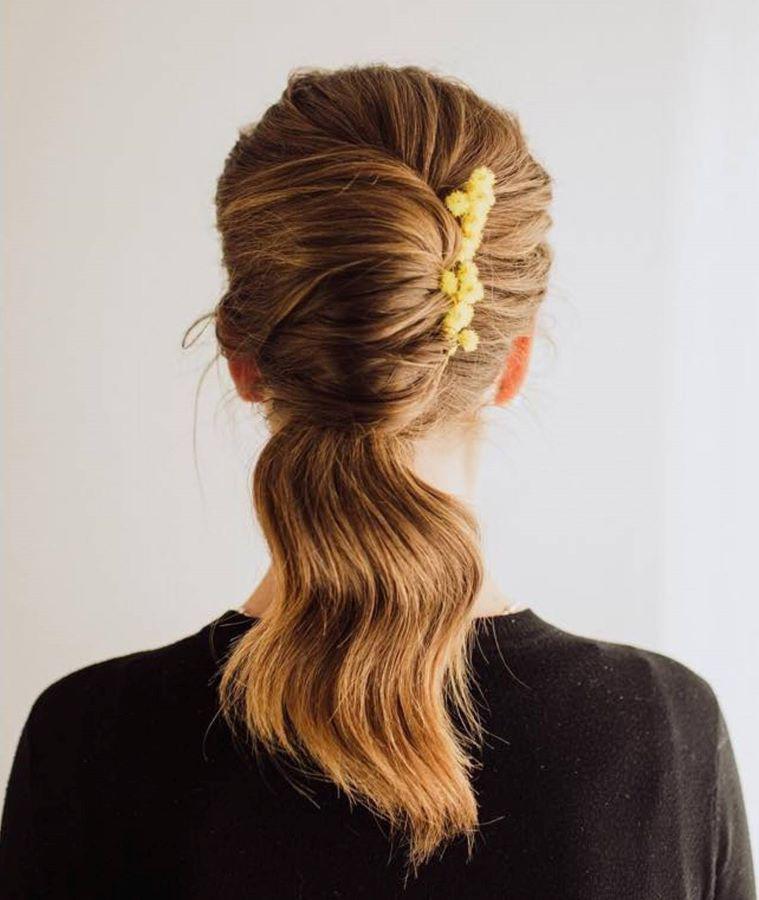 Se peina toda la melena hacia abajo, de la misma manera que si fuéramos a hacer una coleta pero al lateral y se ajusta con horquillas.