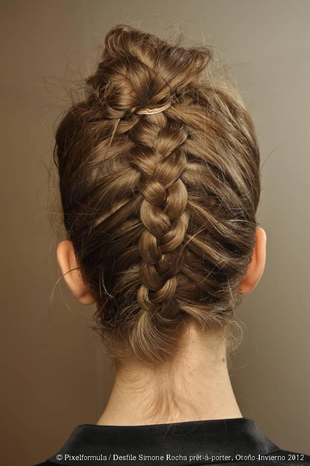 VERSIÓN PUNK: Se realiza una trenza al revés comenzando por la nuca hacia arriba de la cabeza. Cuando llegues a la parte alta de la cabeza, ata con una goma y ve colocando los mechones que faltan de manera un tanto despeinada. Puedes cardar mechones para dar textura o colocar las puntas hacia delante a modo de falso flequillo.