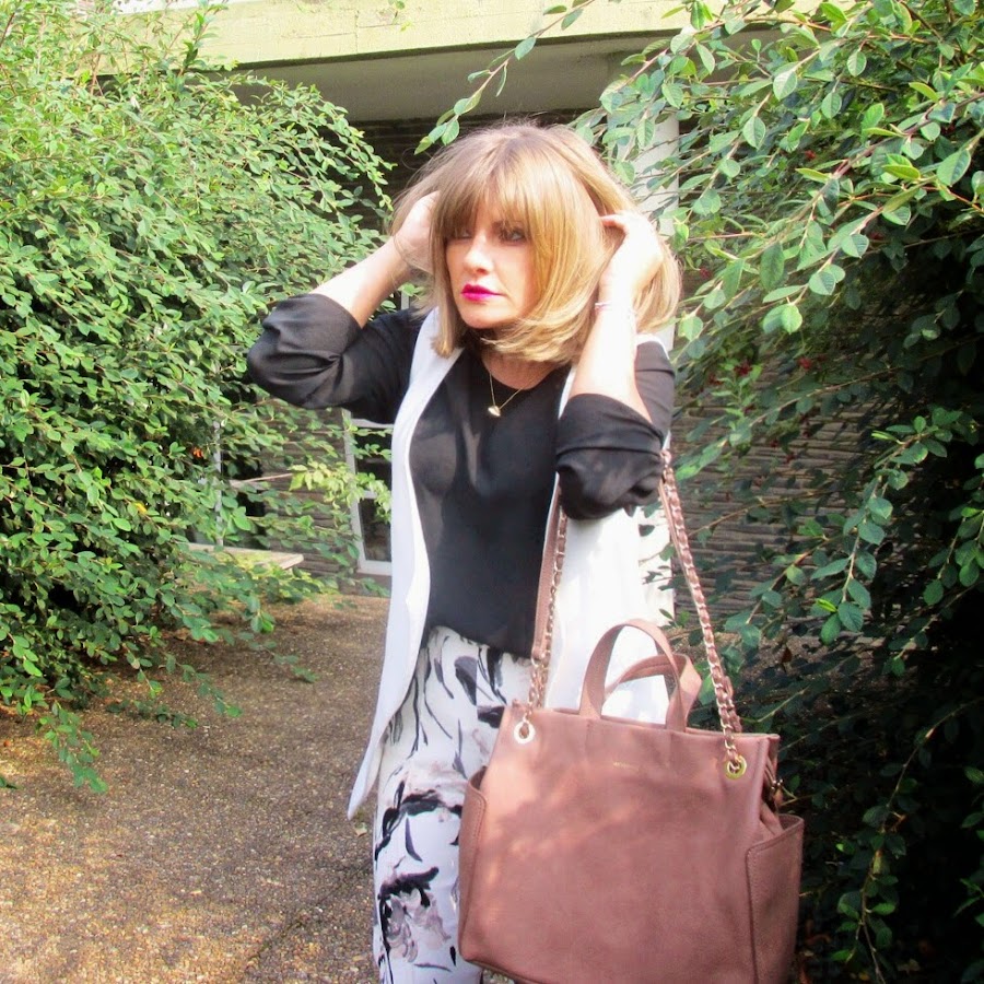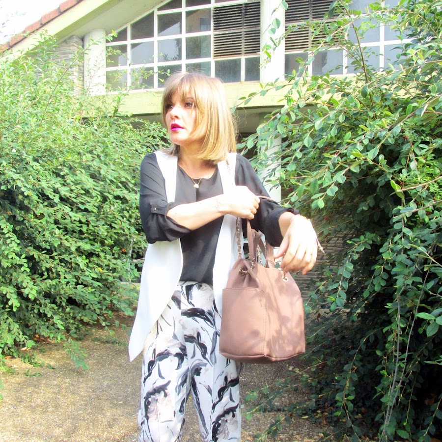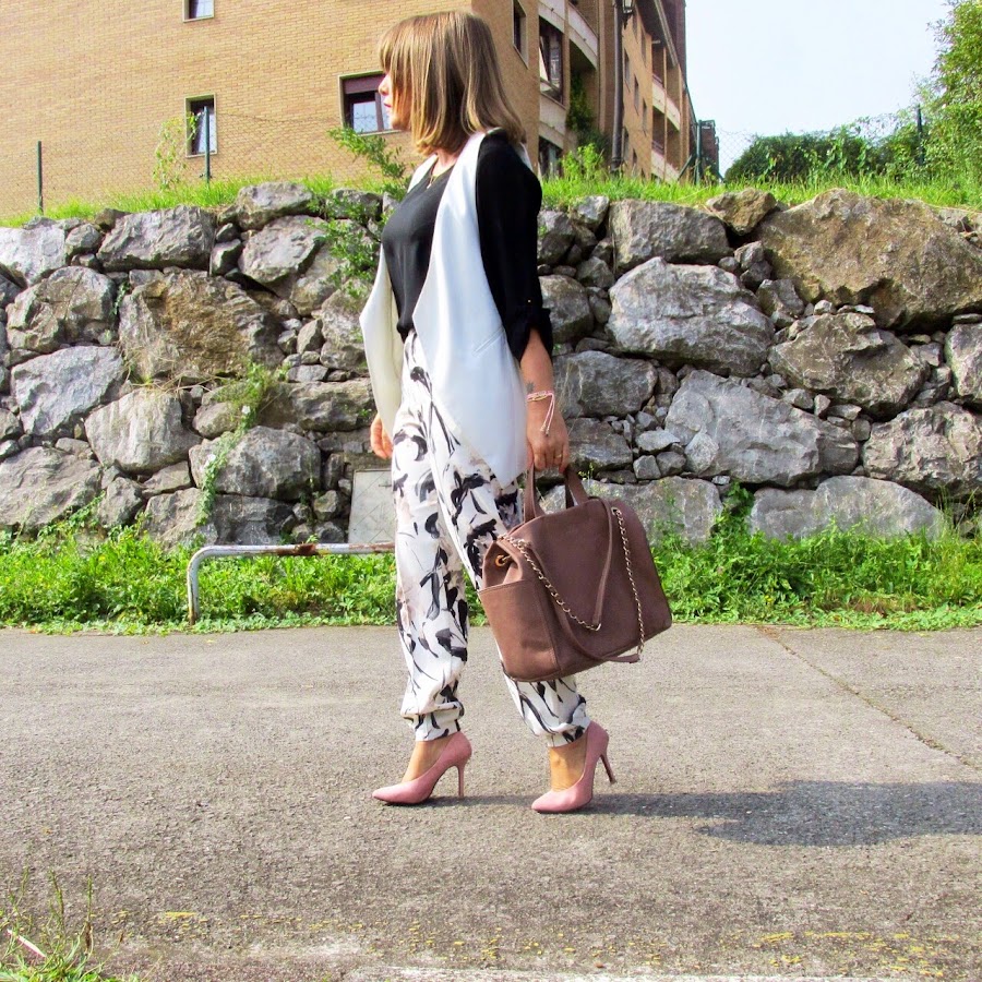 En el caso de hoy unos pantalones estampados en tonos suaves y chaleco masculino componen el look que elegí para mi jornada de trabajo. El toque femenino además de los pantalones lo aportan los complementos en un suave rosa empolvado.