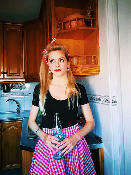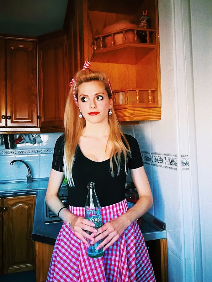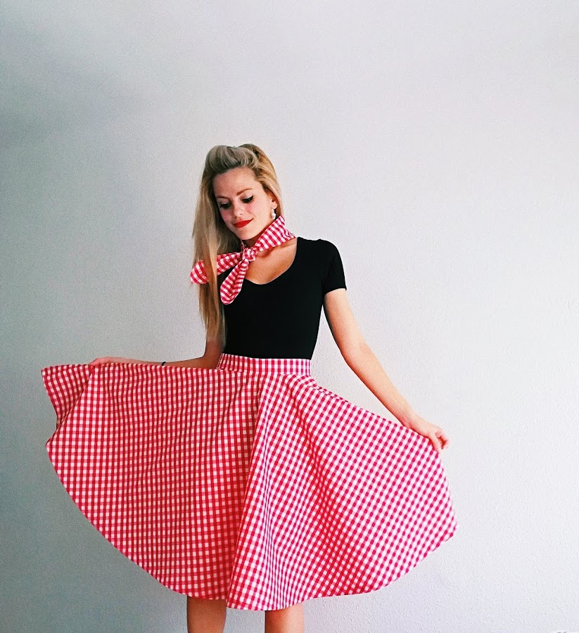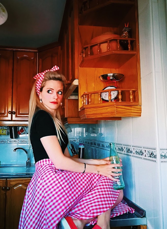 Falda capa y bandana a juego es algo muy característico del estilo Pin-up, pero si además le añadimos un estampado de cuadros vichy, en cualquier color, ya estamos más en ambiente aún.