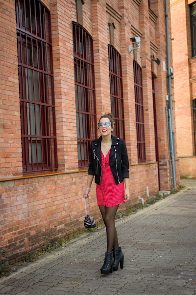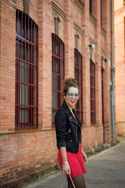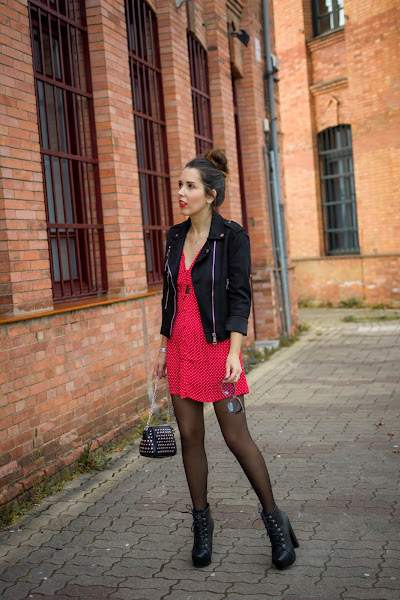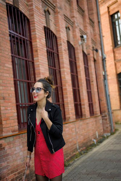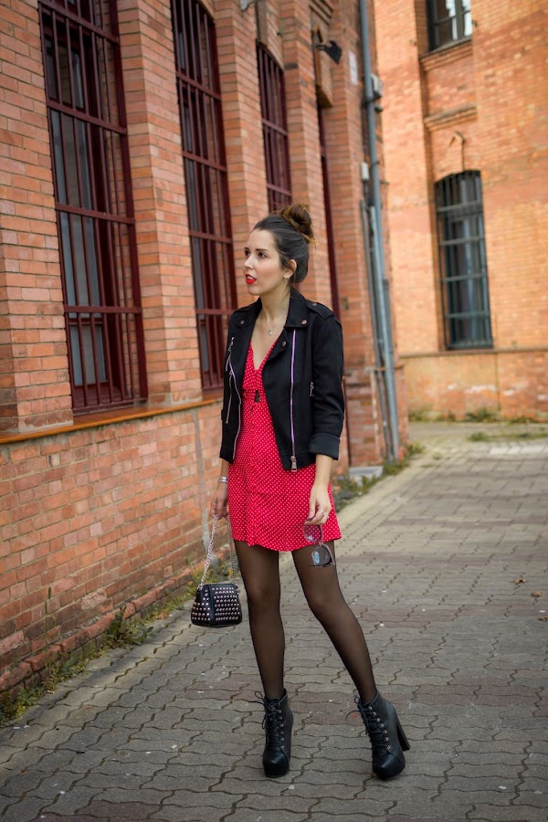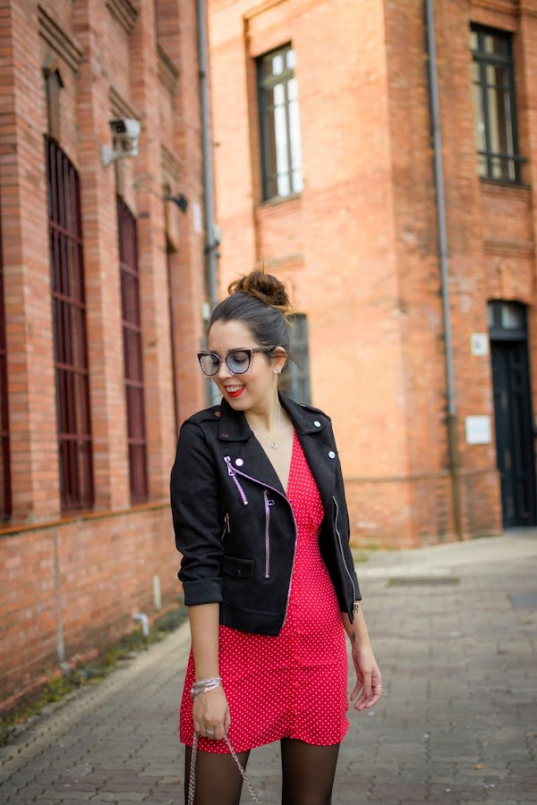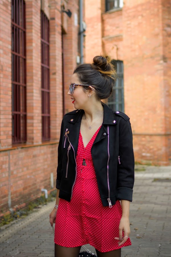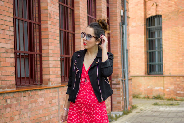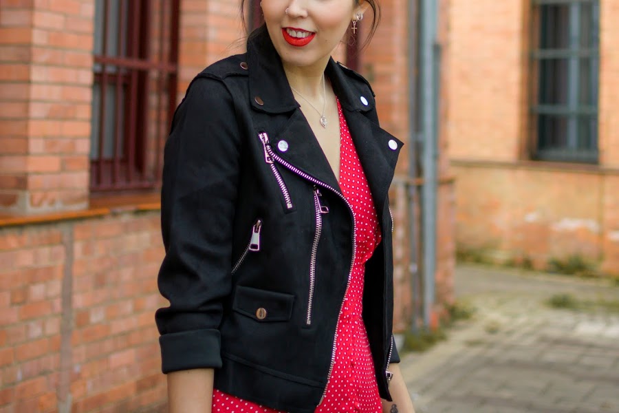 Los vestidos son una de mis prendas favoritas en cuanto comienza el buen tiempo, me parecen súper cómodos y llenos de estilo. Hoy he querido combinar uno en color rojo, de lunares que infinitas veces os he comentado que son tendencia, pero no es porque lo sean, sino porque me he aficionado a lo bien que quedan las prendas que los llevan. Lleva botones en la parte delantera y un corte precioso en la zona del pecho, es de Zaful. También de la misma marca, es la biker en color negro, con tacto de ante y llena de cremalleras plateadas y bien vistosas, para restarle dulzura al look y darle un aire rockero.