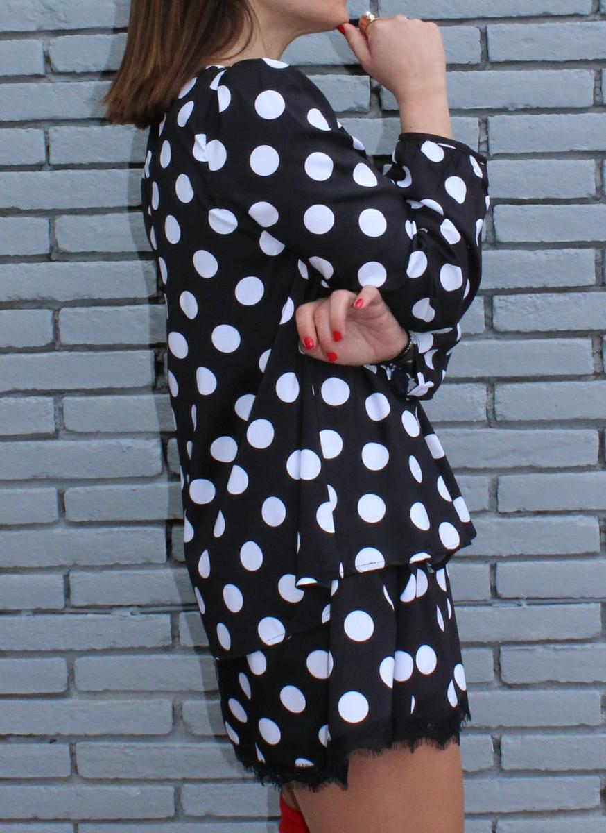 El vestido de la marca ROMWE, formado por doble capa, una más larga rematada con una bonita puntilla y otra a media altura, escote tipo chocker y corte en forma de A. Un bonito vestido reúne un montón de tendencias de la temporada, incluida por supuesto la fiebre por los topos que se ha desencadenado esta primavera-verano.