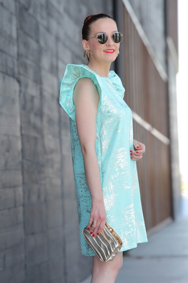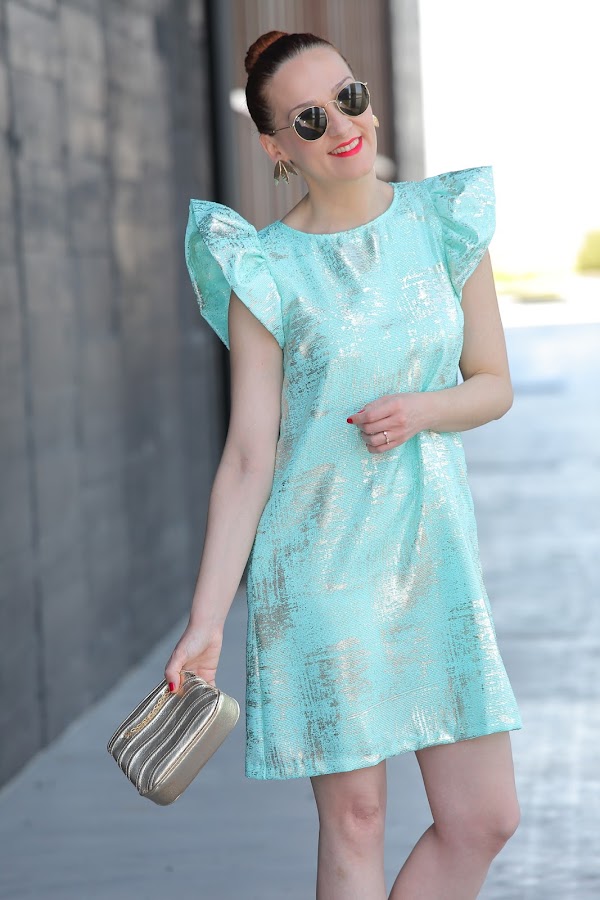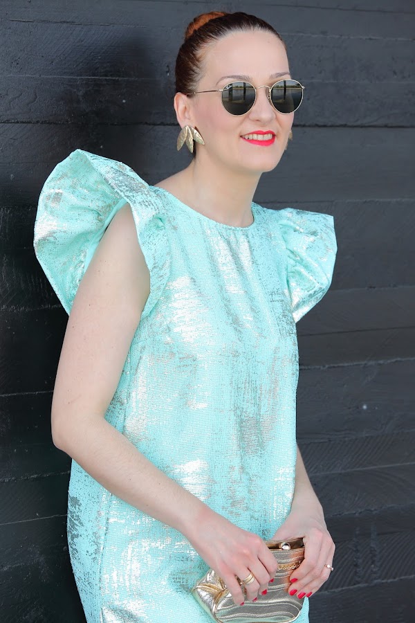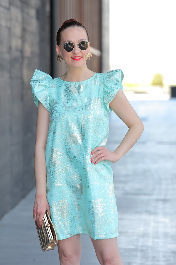Si os habéis fijado el color aguamarina prácticamente nunca lo utilizo en mis estilismos. Es un color que no termina de gustarme porque hace que mi piel se vea aun más blanquita, pero siempre existen excepciones como en el vestido de gasa que os enseño hoy. En un principio lo iba a llevar con sandalia dorada, pero el tiempo se puso feo lloviendo a ratos por lo que opté por unos zapatos dorados cer ...