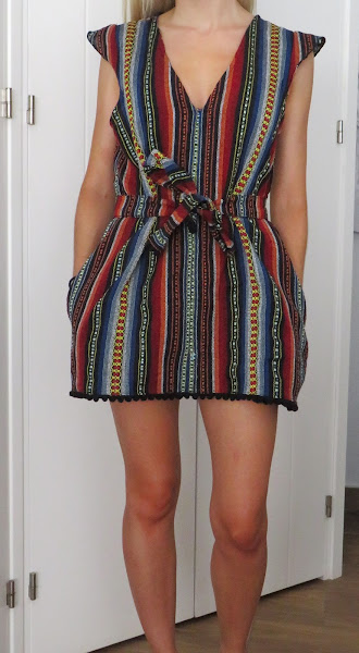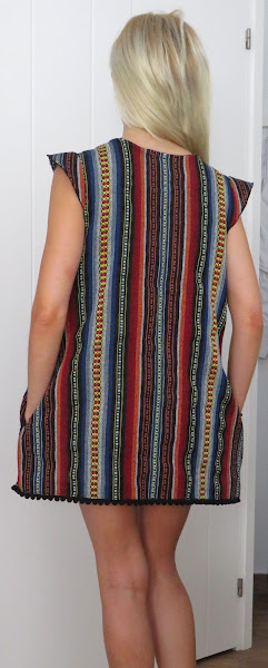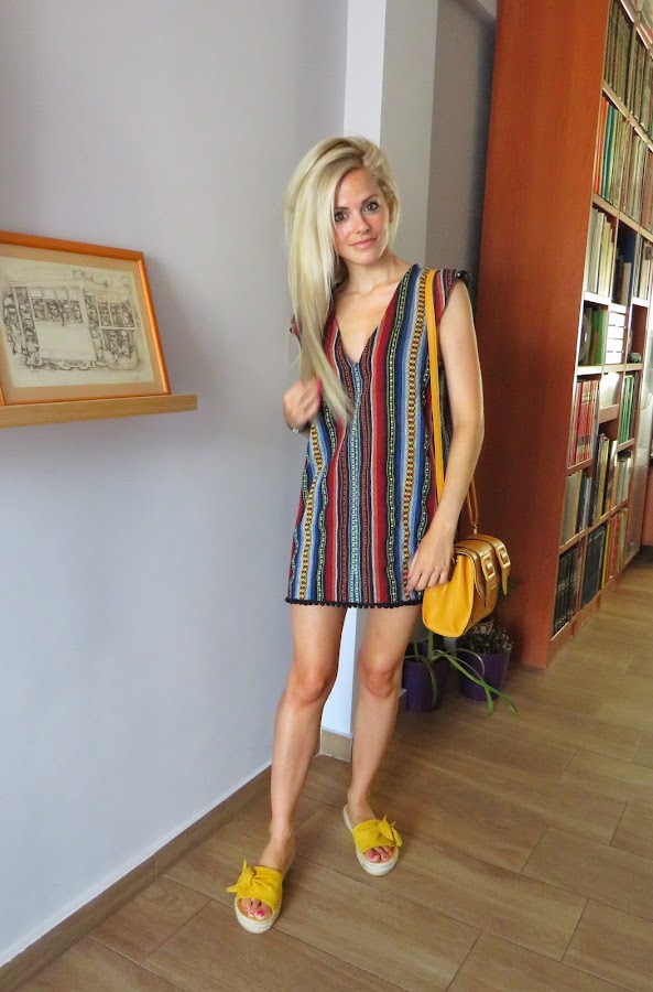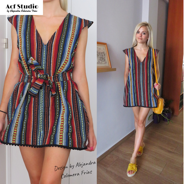 La combinación de colores dispuestos en rayas verticales y el corte, estilo azteca, de este diseño, hacen de él una pieza original y sencilla, pero con cierto toque llamativo para dejar huella. El dobladillo queda rematado con una cinta negra de madroño, para terminar de darle ese toque especial.