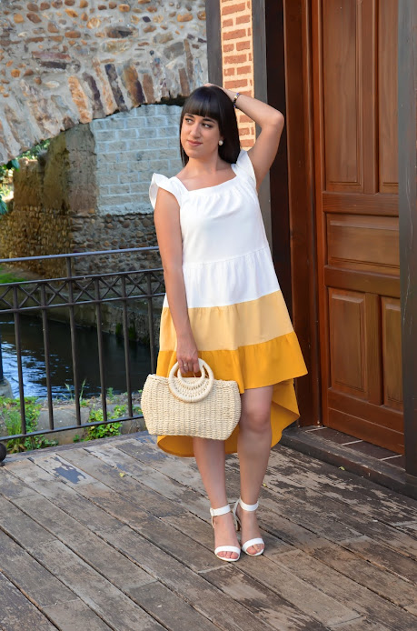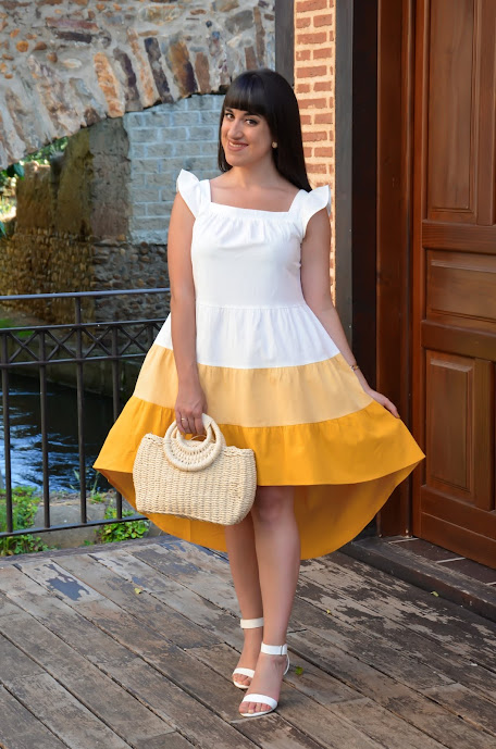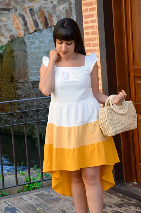 Hoy os traigo otra propuesta para las vacaciones de la mano de Shein y el protagonista no es otro que este fresquito vestido asimétrico con tirantes de volantes en tonos blancos, amarillos y mostazas.