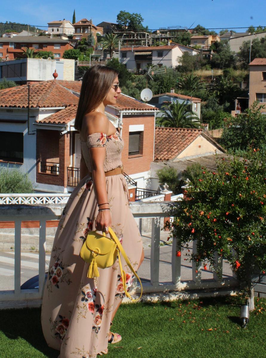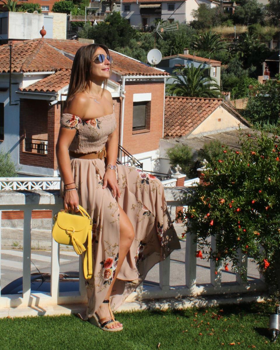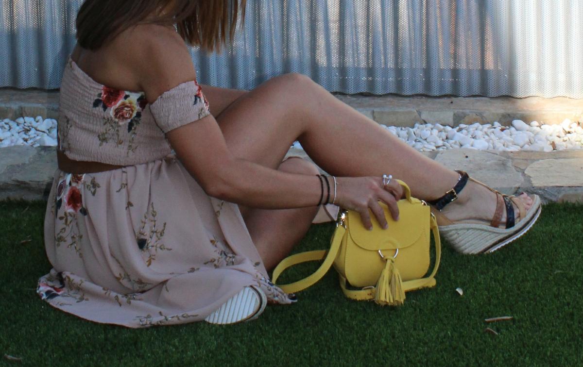 Como complementos cuñas de esparto, bolso en amarillo y para romper un poco el efecto visual de un vestido tan largo y así delimitar la zona ajustada del corpiño con la caída de la parte inferior añadí un cinturón en color marrón.
