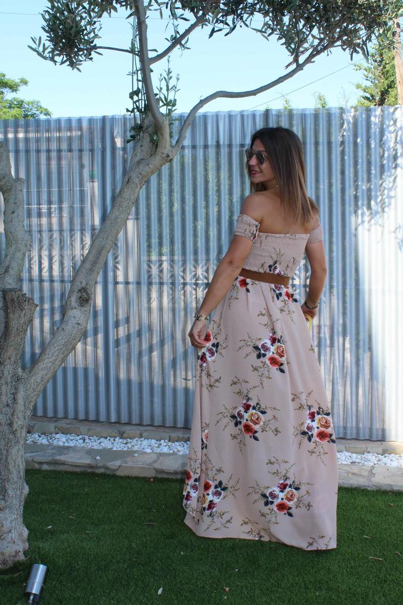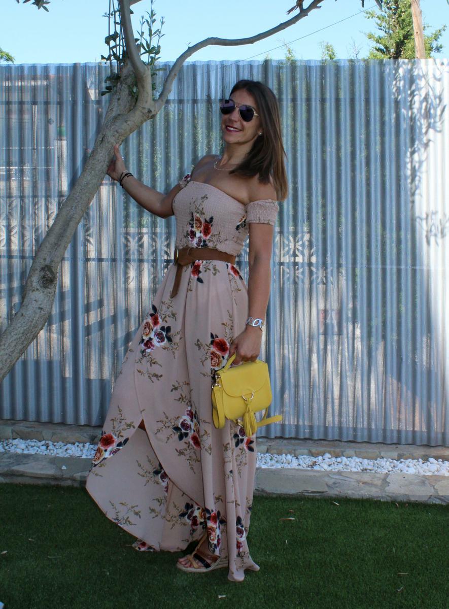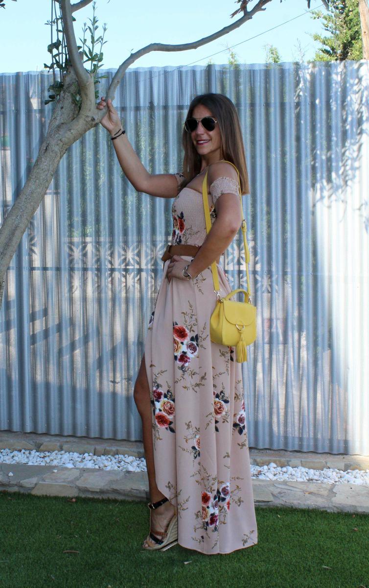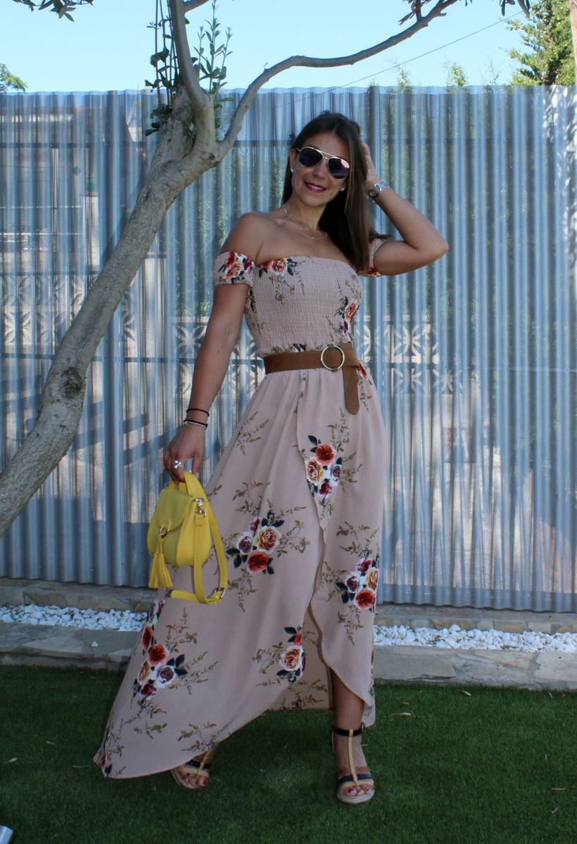 Como complementos cuñas de esparto, bolso en amarillo y para romper un poco el efecto visual de un vestido tan largo y así delimitar la zona ajustada del corpiño con la caída de la parte inferior añadí un cinturón en color marrón.